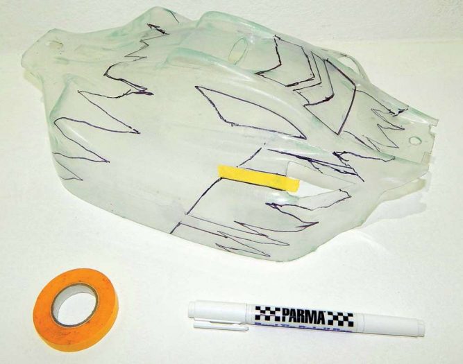 1 As I mentioned I had to get creative with the trimming of this body, but to be honest, the bottom lines were not clearly marked, so I would have had to get creative anyways. I started by roughing out the shape. Then I test fitted it, noted where it was hitting, and worked on the front and back until it sat on the chassis. I then marked where the top of the body mounts sit, and used my body reamer to make the holes, so it would sit down where it is supposed to. The Losi chassis is designed to flex, so in the back I made two holes about a 1/8 inch on either side from where I made my mark. Then I used my hobby knife to straighten out the sides of the elongated hole. Once the body sat in place, I marked the bottom of the chassis, and cut the bottom straight across. I used my hobby knife to score a line and then crack out the vents in back and on the roof. Since this was an E-Buggy I wanted to make sure it got plenty of airflow under the body, so I made two large ,teardrop shaped vent holes in the front where the body sloped down. I’m really glad I did that because it reminds me of a fighter jet. Overall it actually fit the chassis pretty well although it was just a tad too wide on the sides.