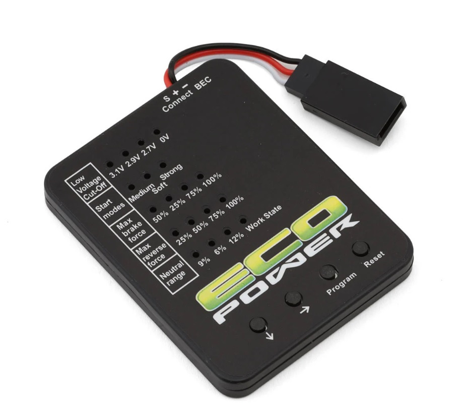 For hobbyists looking to fine-tune performance, this combo is compatible with the optional EcoPower ESC Program Card (ECP-8021 – sold separately). This program card allows customization of essential settings like low-voltage cut-off, brake and reverse force, and throttle response range, making it a valuable tool for dialing in your setup to match current conditions, battery preferences, or driving style.