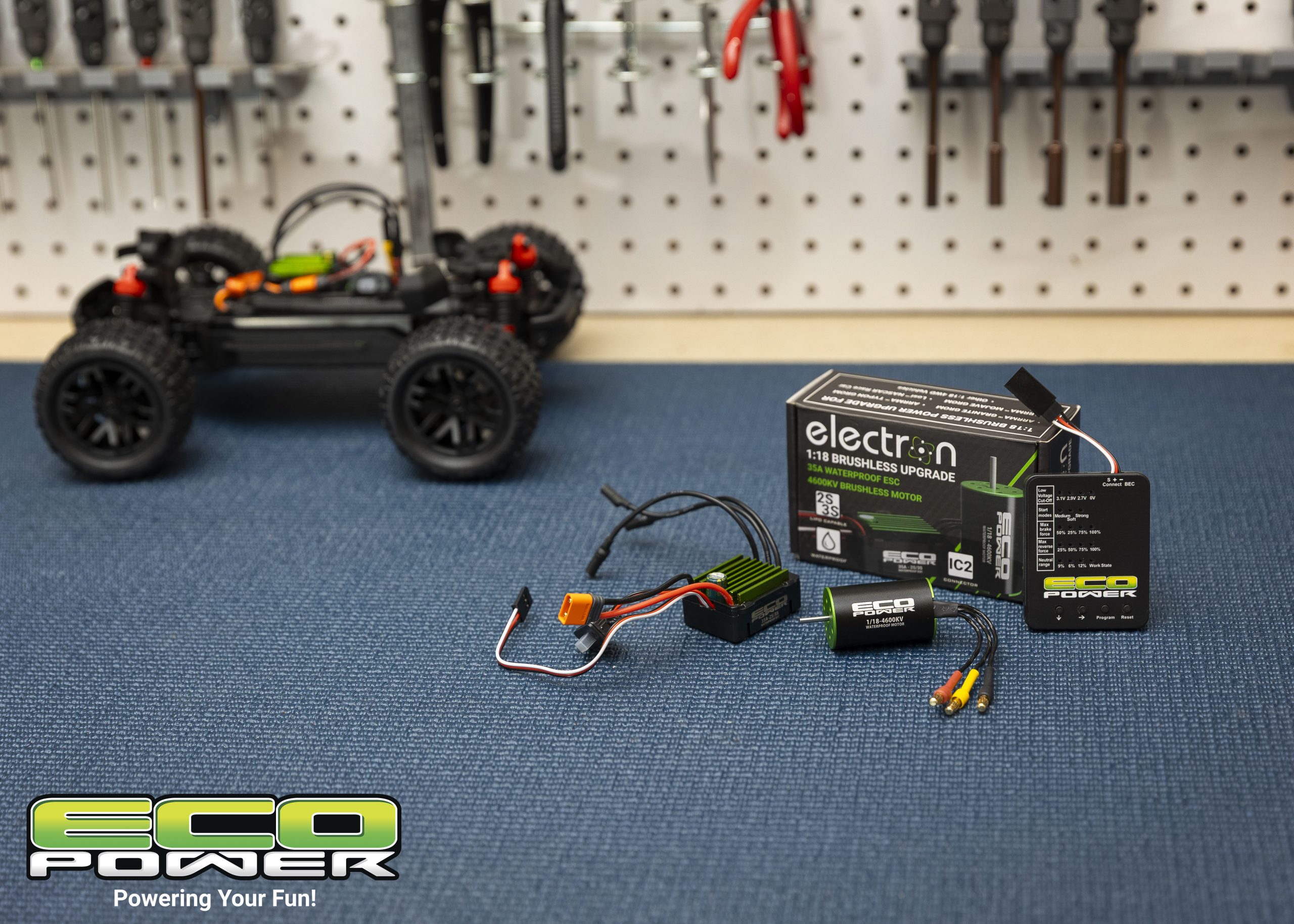 EcoPower is making brushless power more accessible and affordable to all the customers who own brushed Arrma Grom or Losi NASCAR vehicles with the new 2S/3S LiPo capable Electron 1/18 Brushless Upgrade Power System.