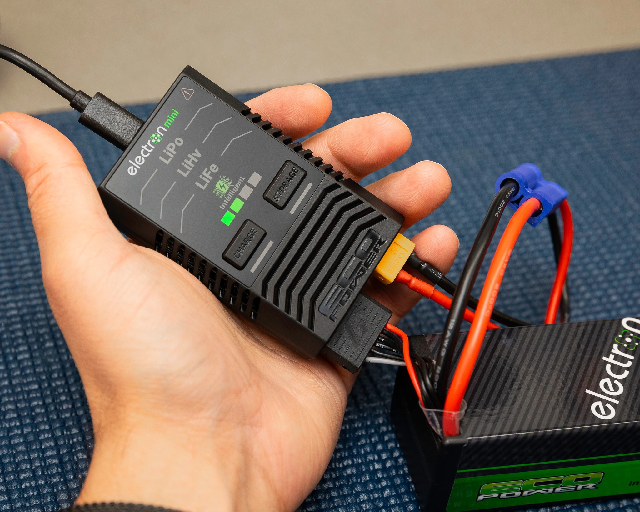 The EcoPower Electron Mini Intelligent Charger makes charging easier than ever. When combined with an EcoPower Intelligent Battery, the Electron Mini will immediately recognize the battery type, whether 2S, 3S, or 4S, and will automatically begin charging using the ideal settings. The Intelligent symbol lights up when an ECP Intelligent Battery is connected, making it easy to identify auto charging is underway and then the charging progress bar shows how far the battery is from full charge. With the ECP-1007 Electron Mini Intelligent Charger, charging is made extremely simple with just two buttons to choose from – Charge or Storage.