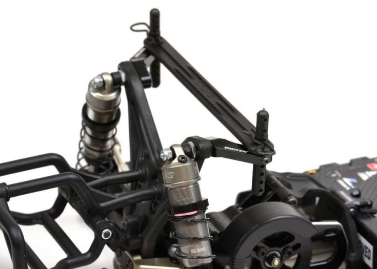 With the simpler design of the Exotek mounts it makes gearbox maintenance easier as well as opens up the possibility of mounting the shock to the front of the rear arms by mounting the body posts to the rear (add 2 body holes) and adding shock holes to your arms.