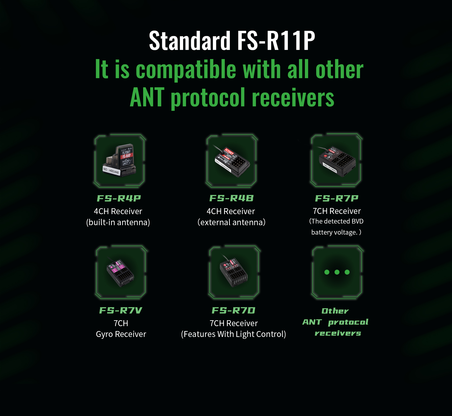 - Bundled FS-R11P Receiver – Full PWM channel utilization via native ANT protocol
