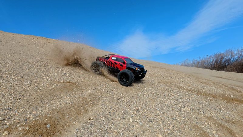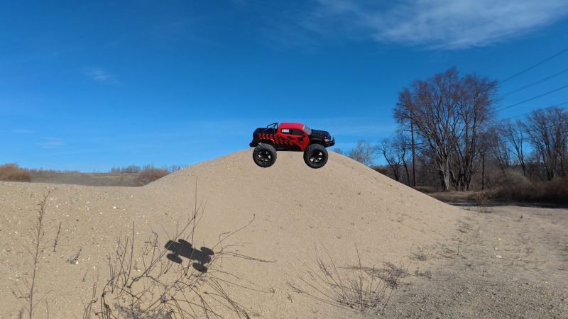 On the dirt lot and sand dunes, the FMT10 Colorado delivers big-air fun and solid handling. On 4S, it launches hard and soars off jumps with confidence. Landings are stable thanks to the stiff suspension, though the truck transfers noticeable power to the front wheels, softening initial punch. This can be tuned by adjusting ESC punch settings or experimenting with diff oils.