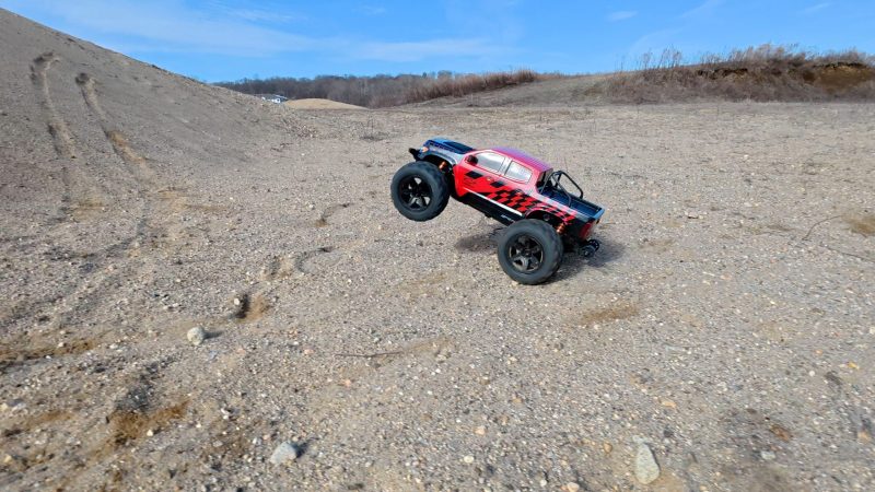 Steering response is excellent after trimming, with plenty of angle and predictable cornering. The monster truck tires grip well but do better on packed dirt than loose sand. Venting the tires is a must to avoid ballooning and sand buildup. Braking is strong but can be dialed back for smoother landings.