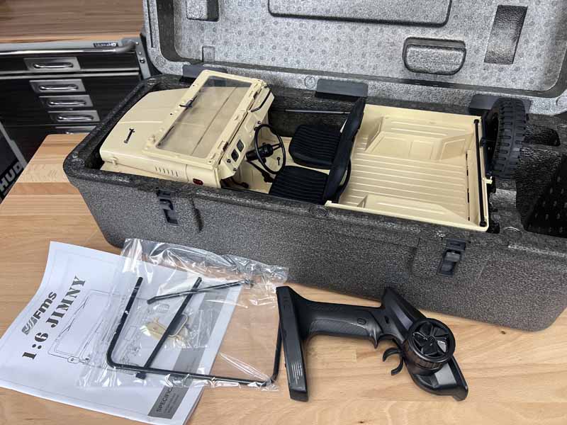 The packaging that FMS models come in is some of the best in the RC world. The Jimny comes in its own styrofoam carrying case. The model is mostly assembled, but needs a few accessories bolted on like the roll bar and mirrors. The windshield folds up and clips into place. You’ll also find an FMS radio and instructions in the box.