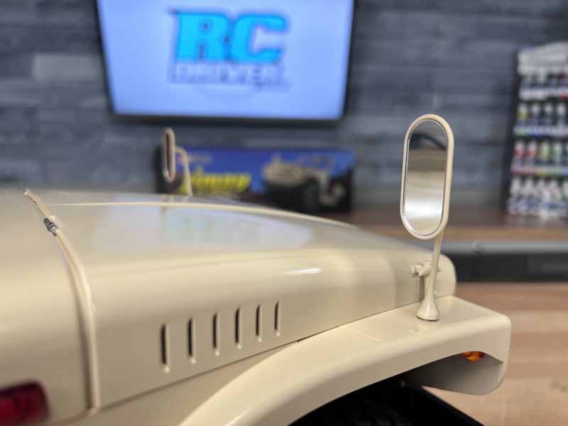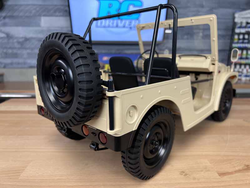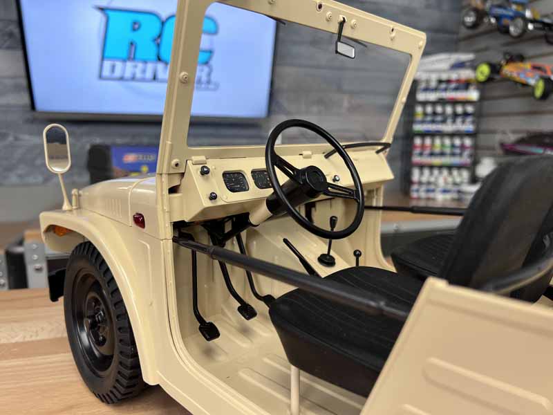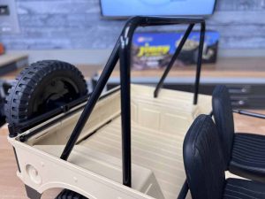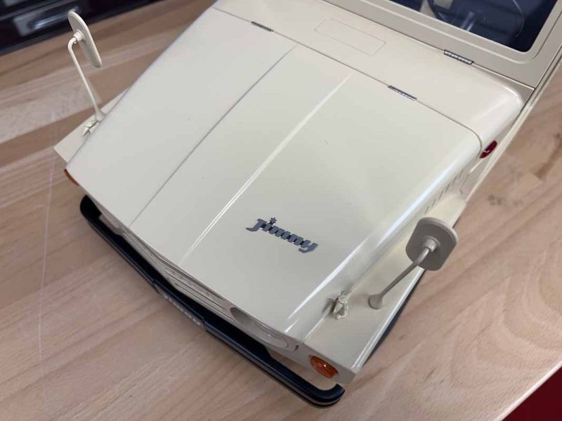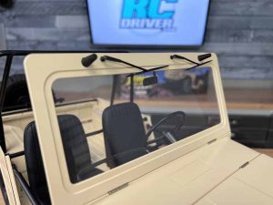 The Jimny body is molded in a tan hard ABS plastic and is loaded with detail. The hood opens to access the battery tray and electronics. The grill is slotted and reveals the radiator behind it. Inside the cab area tons of detail has been added to the dashboard and under it are the pedals. Of course there is a steering wheel and the seats are a soft rubber, so realistic! Out back a spare tires sits on a mount and under it is a bumper with tail light lenses. Oh, that reminds us, it comes with LED’s in the headlights from the factory!