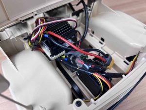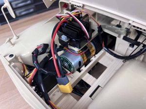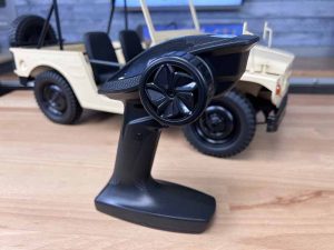 A standard servo takes care of the steering and it appears to be a Hobby Wing based speed control sending power to the silver can motor. Just be aware you’ll need a battery with an XT60 plug to power the car. The transmitter is a FMS unit with all the basic trim functions necessary to dial in the Jimny.
