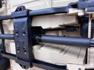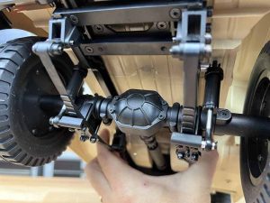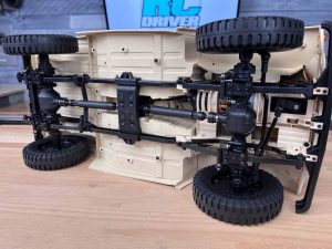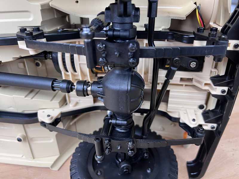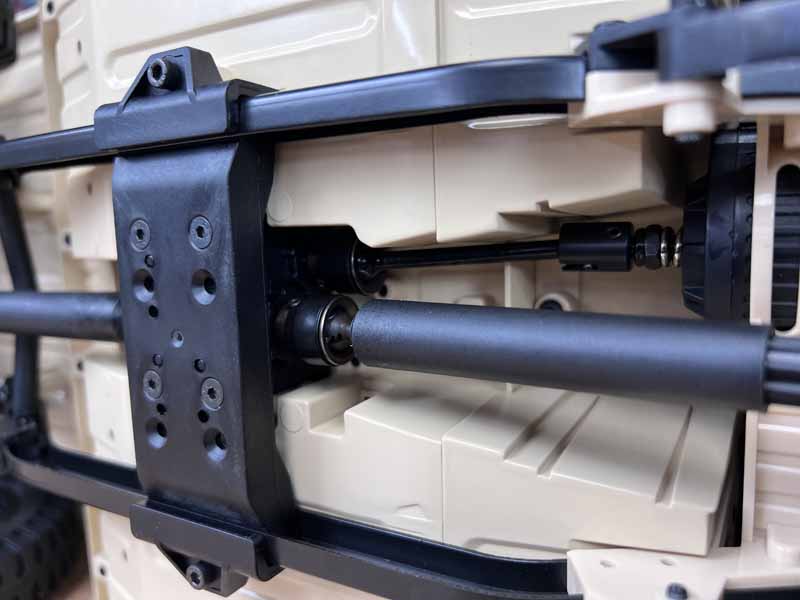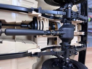 The suspension looks so realistic. Leaf springs offer rebound while friction shocks add to the scale look. The solid axles are well detailed and are loaded with bearings. Nestled up in the top of the chassis is a compact transmission that goes to a transfer case in the center with slider style driveshafts transferring the power. All this meets up with a metal ladder frame chassis.