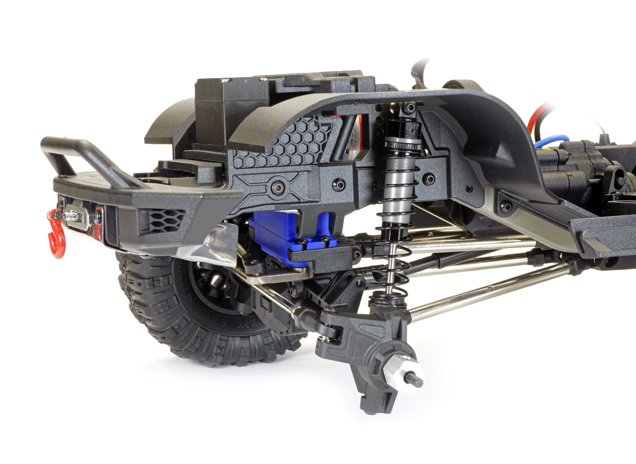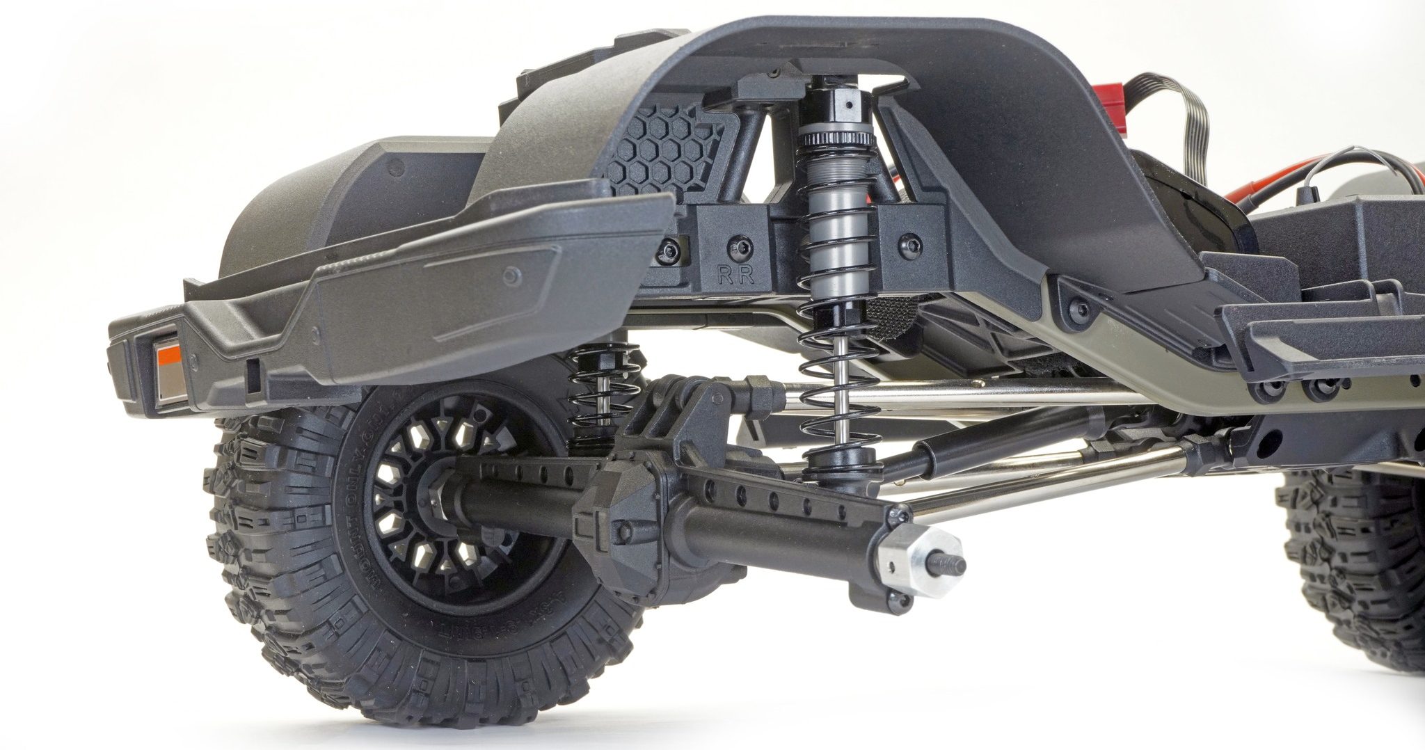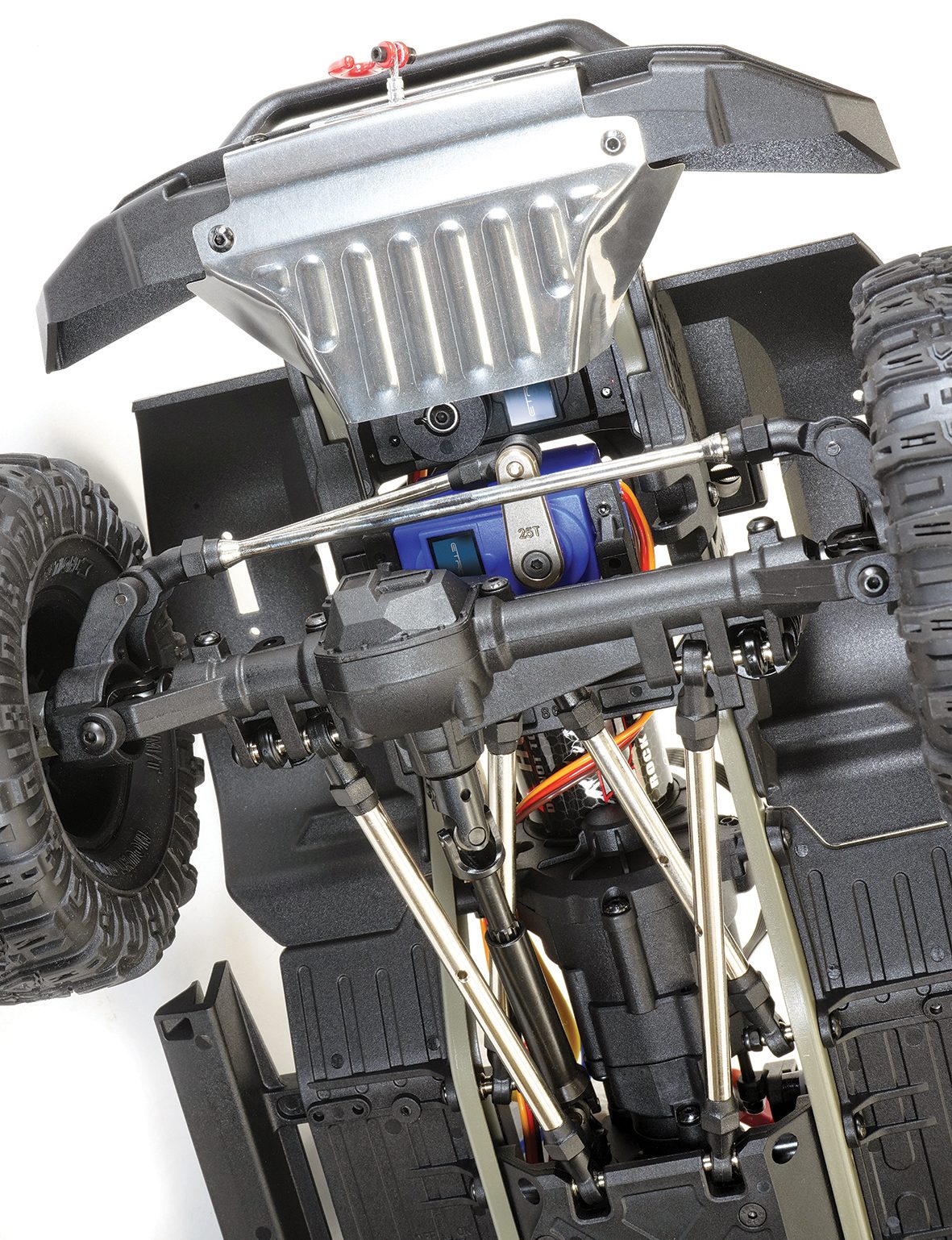 On the chassis are molded inner fenders to fill each wheel well, while oil-filled, adjustable aluminum shock absorbers provide exceptional rough terrain handling. The scale front bumper accommodates a winch cable and hook protected by a stamped aluminum lower skid plate. The cable can be extended up to 90cm via a 25kg MG 360-degree winch servo.