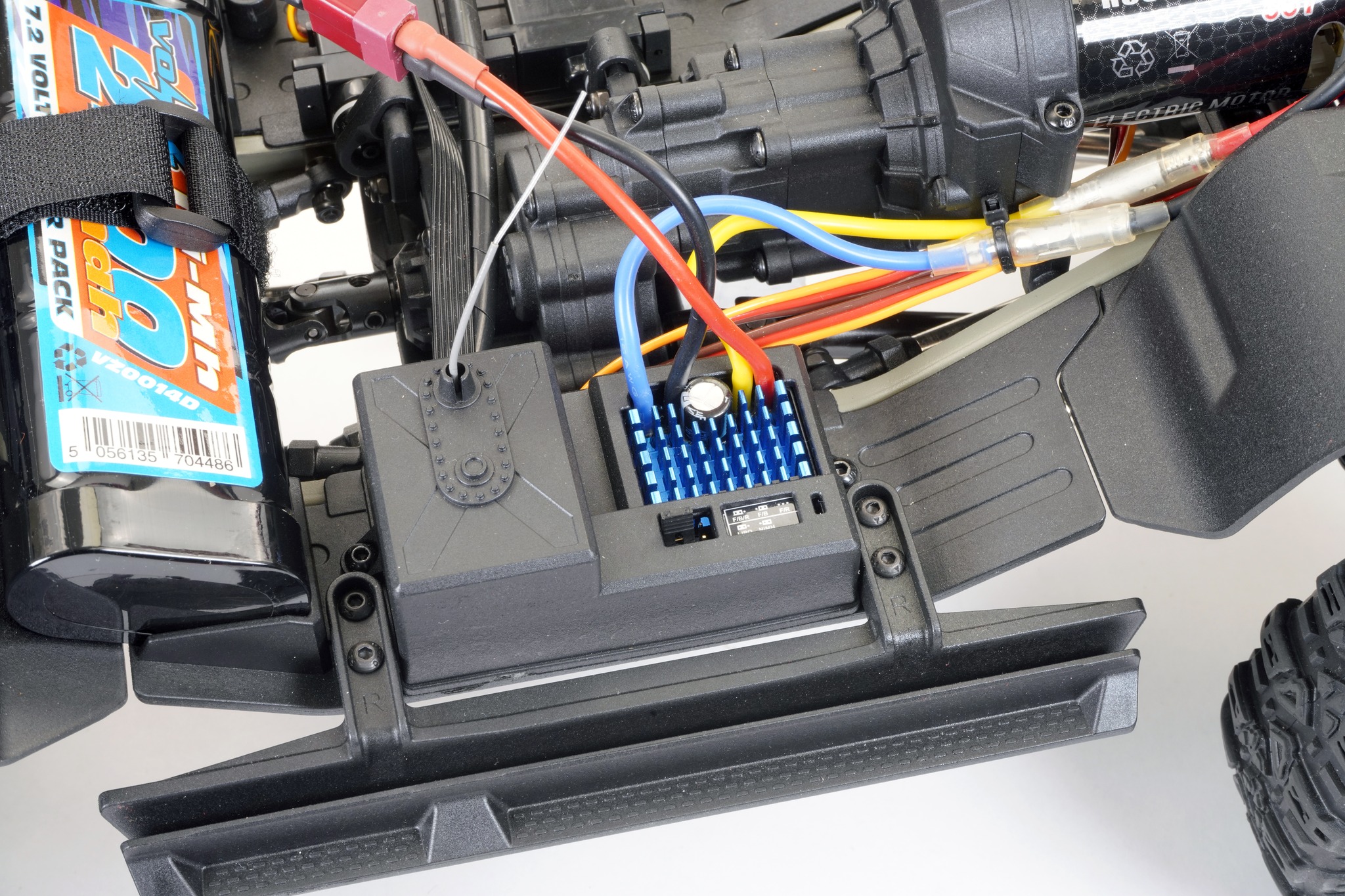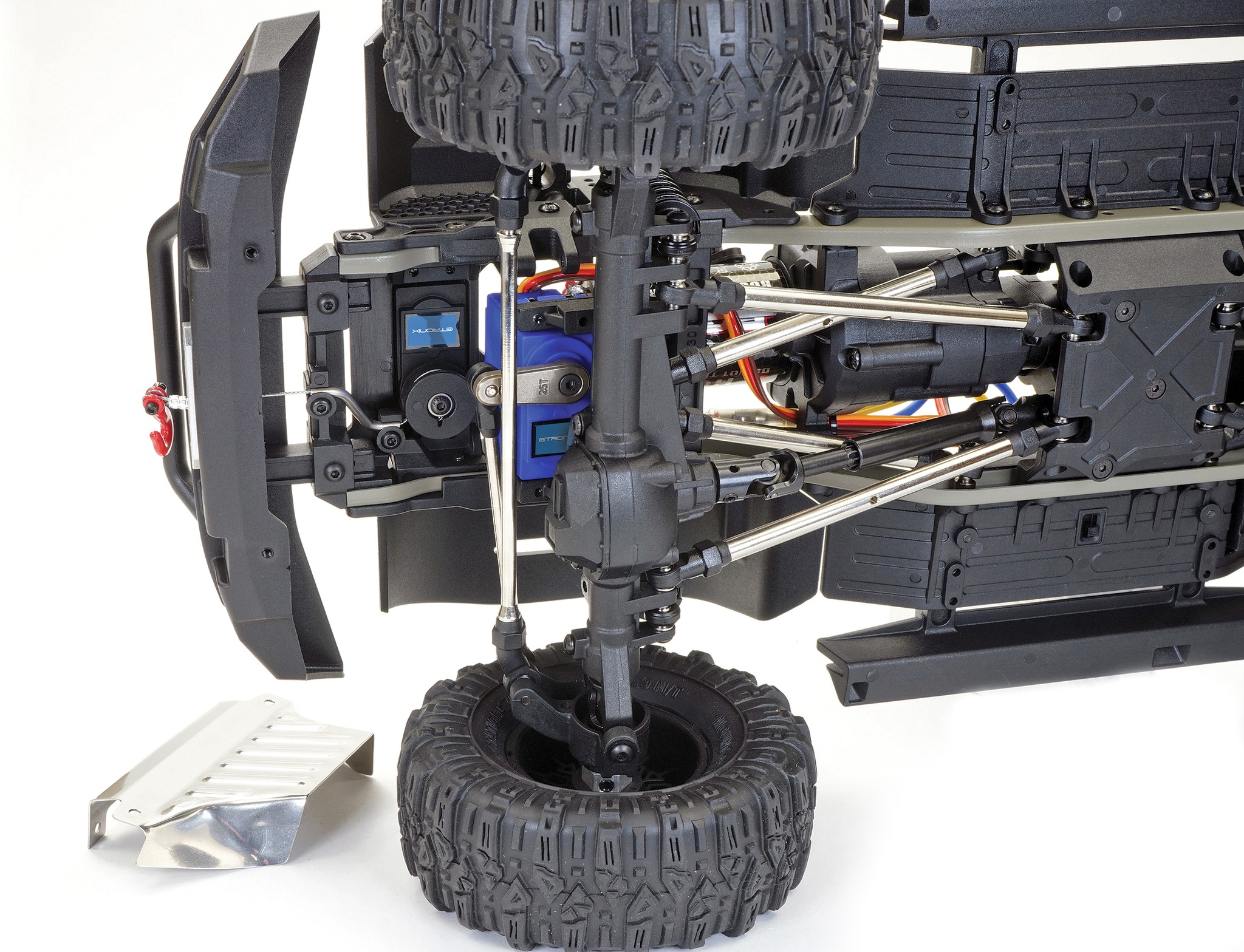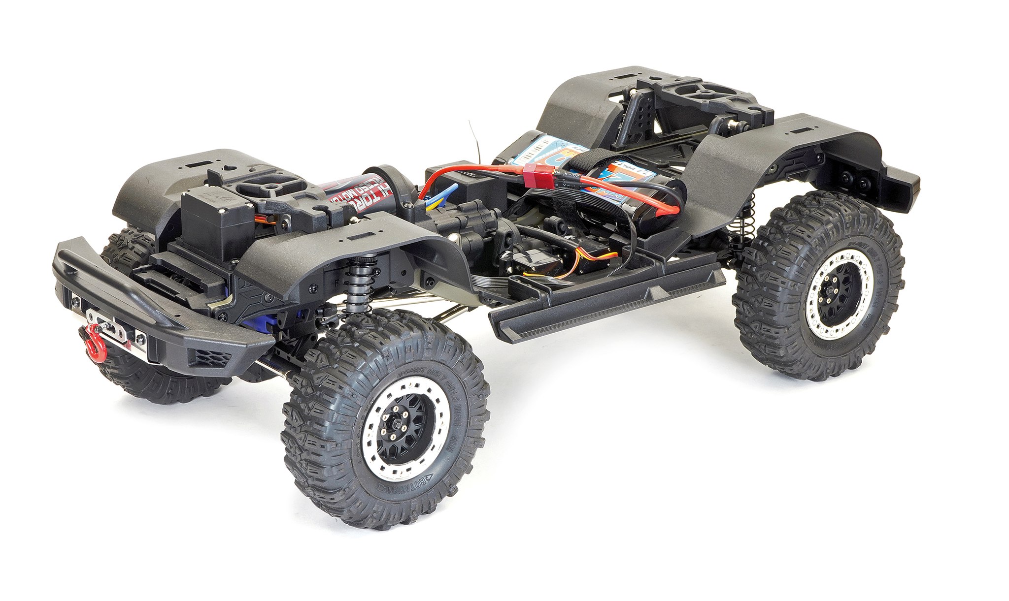 On the chassis are molded inner fenders to fill each wheel well, while oil-filled, adjustable aluminum shock absorbers provide exceptional rough terrain handling. The scale front bumper accommodates a winch cable and hook protected by a stamped aluminum lower skid plate. The cable can be extended up to 90cm via a 25kg MG 360-degree winch servo.