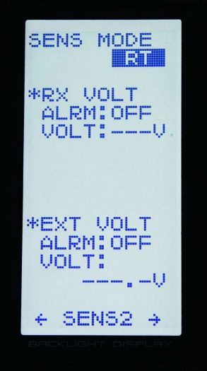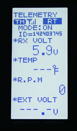 The LCD display is nearly identical to one of Futaba’s newer four-channel radios, the Futaba 4PLS. It is a very bright, backlit display that is very visible in multiple light- ing conditions. In the menus you can even change the contrast setting, something not found on all transmitters. The display is located right in the middle of the radio and makes it very easy to glance down and browse all of the information the 4GRS can transmit. There are plenty of modes to cycle through on what information is shown to the user. The default mode shows a digital representation of what each channel’s inputs are along with digital trim indica- tions and basic telemetry and receiver volt- age. As you use the main toggle to cycle through you will see displays more dedicat- ed to specific functions. I really like the telemetry display; it is so easy to quickly read what is going on with your model. Other modes include more specific voltage readings and a log mode which shows usage time and alarm status.