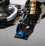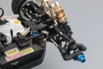 • The G8X has an excellent suspension setup that is very easy to tune quickly, which is very important when experimenting with different setups. Starting with the shocks, you will not find any cheap plastic pre-load clips, these are threaded anodized aluminum all around. They are also very substantial in size (16mm bore to be exact) so they should work on the roughest of conditions. Sway bars are fitted on the front and rear, essential for balanced handling characteristics on the track. I like that everything is fully adjustable, the camber angles are easily changed via steel turnbuckles. The shock towers are very beefy and match the gold anodized look of the buggy and have multiple shock mounting positions. Team Energy also designed these shock towers so that the center of gravity is kept low, without loosing any structural integrity. There are shock protectors and dirt guards to keep the shocks and rear arms from getting messy and make it easier to keep your G8X looking brand new. The stock setup feels very plush, probably better suited for bashing duties right out of the box.