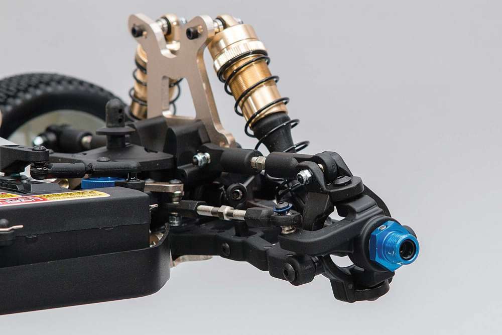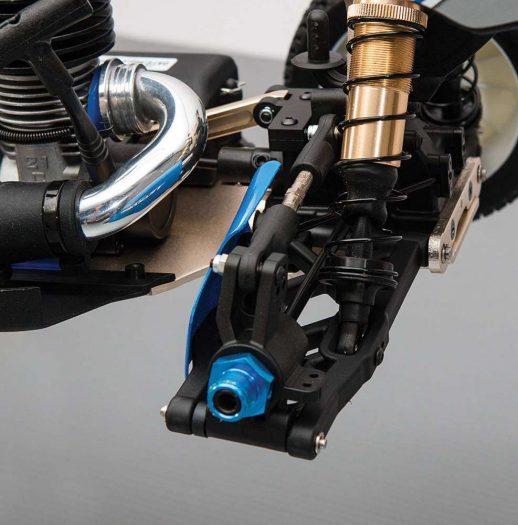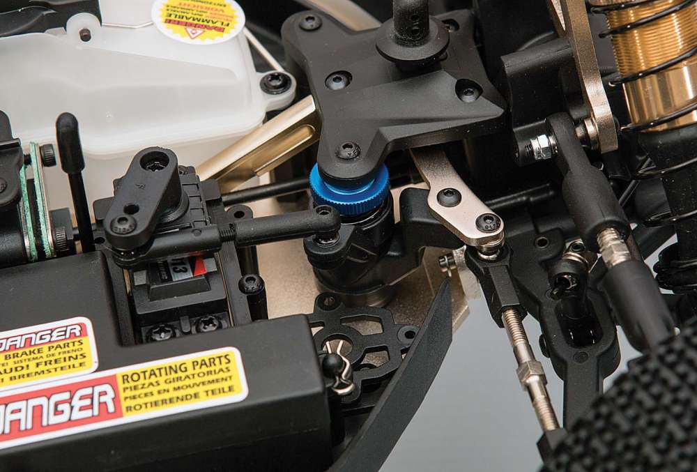 • The dual-bellcrank layout is the tried and true method that all 1/8-scale racing buggies use. The servo saver is easily adjusted and is mated with a waterproof servo capable of about 180 ounces of torque, more than enough to turn buggy wheels. Like the camber setting, toe angles are adjusted with the included steel turnbuckles. The stock tuning setup has a small amount of toe out, which is just the way I like it on 1/8-scale buggies in order to get a quick turn-in response.