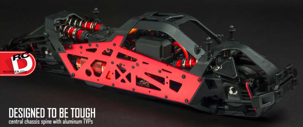 16 mm aluminum oil shocks in rocker laydown style to keep you in control on the roughest turf.