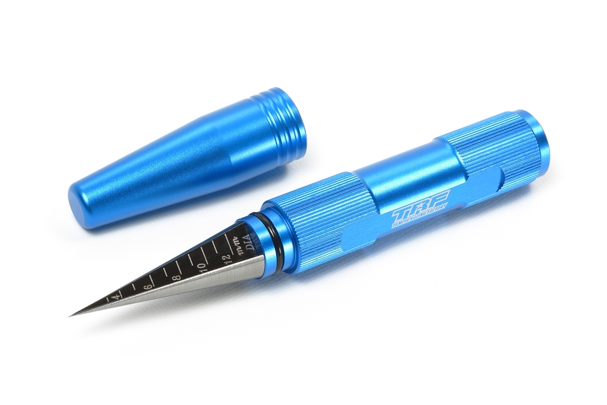 Although you would not use the Tamiya TRF Car Body Reamer very often, it is still an invaluable tool when finishing a RC car body. It is purpose built for making perfect circular holes in bodies for the body posts to pass though. Don’t be that guy using a hobby knife who would spin it like screwdriver to create the body post hole. This leaves a hacked-up jagged hole. The TRF Car Body Reamer features ‘stepped’ sections which allow the measurement of holes up to 12mm in diameter in 1mm steps. Each step has a straight section to prevent the holes from being made any large than desired. A blue anodized aluminum cap is included to ensure that the tool can be safely stored when not in use.