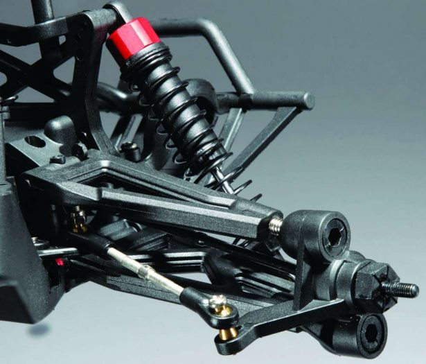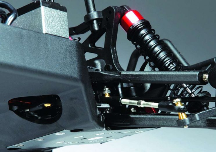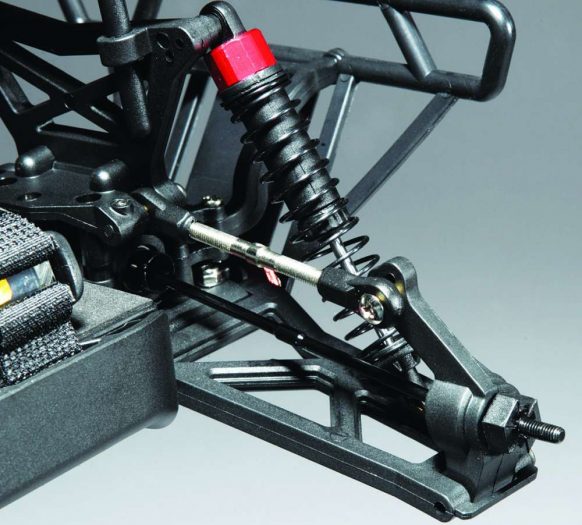 SUSPENSION: The Invictus provides you with four independent oil-filled shocks. Each shock has a 10mm bore with bladder top bodies. Single rate black springs topped with cool looking red shock caps complete the look of the suspension. Adjustability doesn’t stop with different oil viscosities, you can change the shock location on both the top and bottom mounts to suit your driving style or for different conditions. The tires offer a good bit of cushion with a soft to medium tire foam which work together with the suspen- sion to give you those fun monster truck characteristics while bouncing through and over objects. Up front you have a pivot ball setup which includes an upper A-arm. On the rear it is a single A-arm setup.