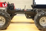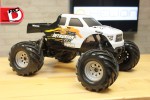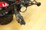 – Cool details! The body on the Intrusion has some wild graphics and just the right amount where the truck isn’t too busy but still eye catching. The front upper bumper gives the truck a mean look and a wheelie bar out back looks great while adding functionality. What really caught our eye were the bolt on side pipes on the chassis. Little details like this turns heads.