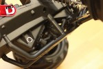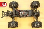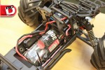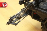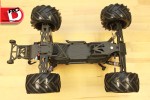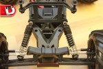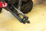 – Durable Suspension. A quick twist test on the suspension arms reveled the arms are made up of a durable composite plastic designed to flex in a crash rather than break. The metal turnbuckles are nice and thick and better yet adjustable. Plastic body oil filled shock damp each corner and attach to bulkhead like shock towers up top which appears to be a pretty strong set-up. The big standout are the aluminum front arm brace and the aluminum rear suspension pivot block which proves this truck was built for bashers in box stock form.