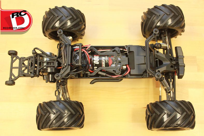 – High clearance chassis. The truck has a high clearance chassis so the truck is less likely to get hung up on stuff while out terrorizing the terrain. The lower chassis plates with trusses do a great job of keeping the platform stiff. The narrow chassis incorporates a radio box top up front to keep the receiver protected. Battery access is easy with a flip up plate that is secured with two latches.