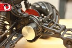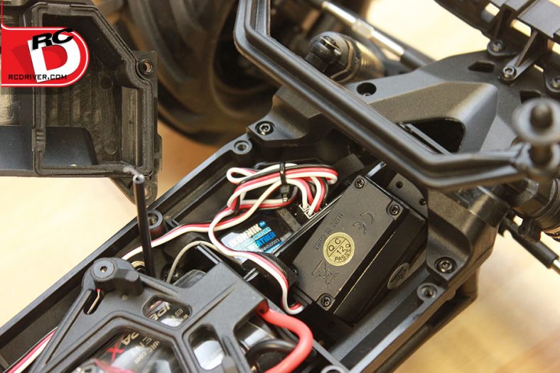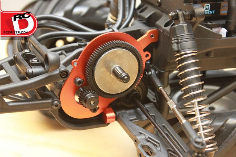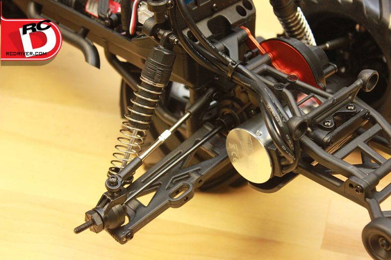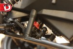 – Metal Mesh. The gears inside the transmission are all metal and since this truck can be run on 3S LiPo, we’re happy to see the driveline bulked up from the factory. A dual pad slipper pinches a 48-pitch spur gear, but we were more dazzled by the aluminum motor plate behind the spur with aluminum support brace. Nice features.