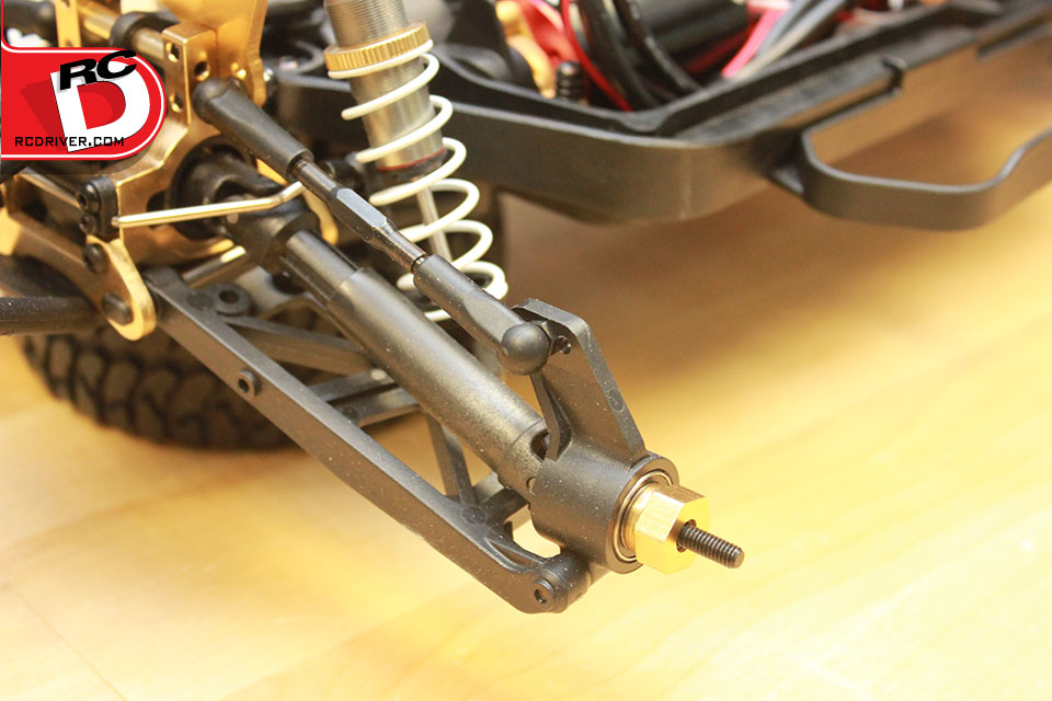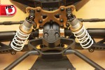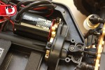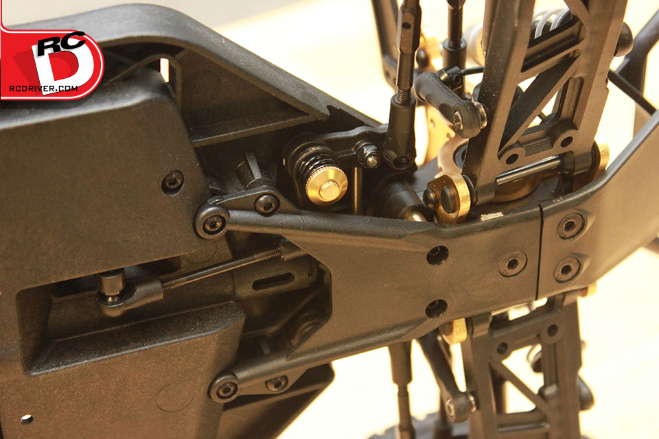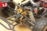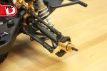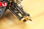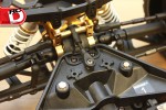 – Lots of aluminum goodies can be found on the FOUR, like thick shock towers, bulkheads, steering knuckles, 12mm wheel hexes and steering posts. All of these parts are well machined and anodized a bright gold for a classy look.