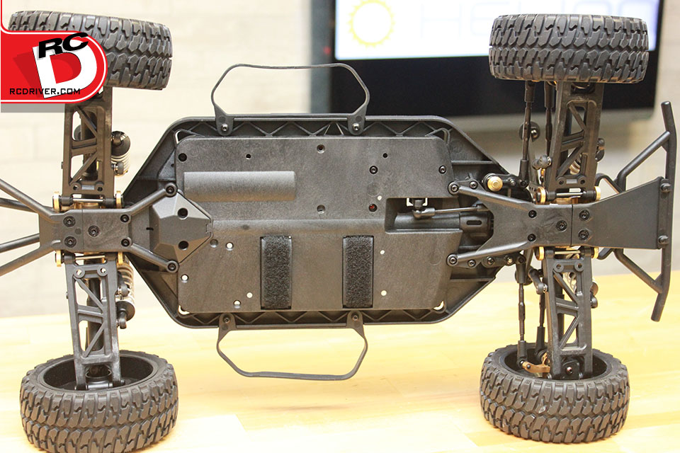 – The FOUR 10SC has what appears to be a mid-level chassis although Helion calls it a New High-Ground Clearance Chassis. We say mid because its not an LCG chassis and doesn’t appear as high as others on the market. Its seems like a great overall combination of both worlds, good ground clearance but still low for better stability. The plastic is and design of the chassis combine to make a solid platform for the truck.