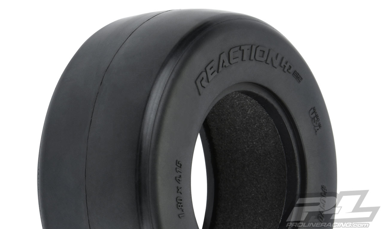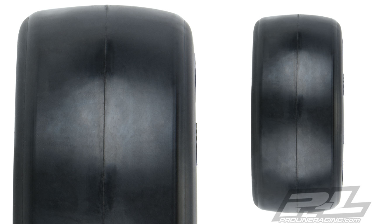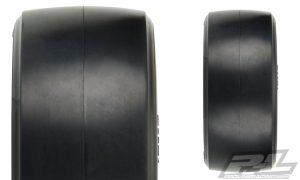 With one glance you can tell that the Reaction HP tires are intended for drag racing since the tread is smooth. This style of tire is called a drag slick. Pro-Line made the Reaction specifically for no-prep drag racing and further upped its performance by making them belted. Inside of the tire is a high-performance herringbone weave pattern belt so that the tire will not balloon or expand during use. When drag racing, the belted feature is a clear advantage by giving you maximum control of your drag car and let you get the power down. Soft S3 compound is used to provide unmatched stability and serious grip. Pro-Line gave the Reaction tires a maximum speed rating of 90mph or about 7,000rpm. If you surpass this rating, you risk breaking the internal belt. The Reaction tires mount onto 2.2”/3.0” short course rear wheels like the Pro-Line Pomona (#2776-03) drag specific wheel.