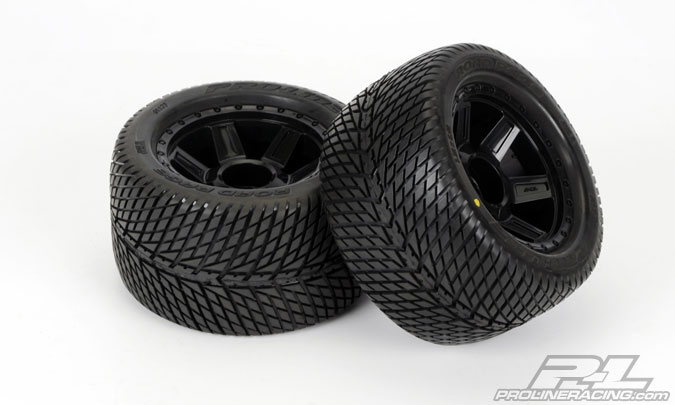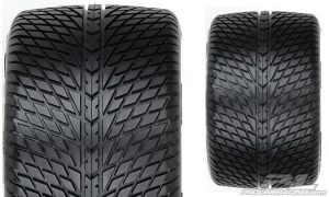 The Road Rage 3.8” tires are perfect for racing around the paved areas of your neighborhood or at your local on-road race event. Pro-Line designed the Road Rage 3.8” tires by incorporating an ultra-low sidewall which translates into the maximum in predictability, stability and responsiveness for your monster truck. You will notice that they have an aggressive and deep V-tread design so that the dirt and debris that is normally found on asphalt surfaces won’t hinder your vehicle’s performance. Pro-Line offers the Road Rage 3.8” tires in three variations: mounted on Desperado black 1/2” offset 17mm wheels, mounted on Raid black 8×32 removable hex 17mm wheels and unmounted without any wheels. The tires are made to fit directly onto all 3.8” Traxxas-Style bed wheels.