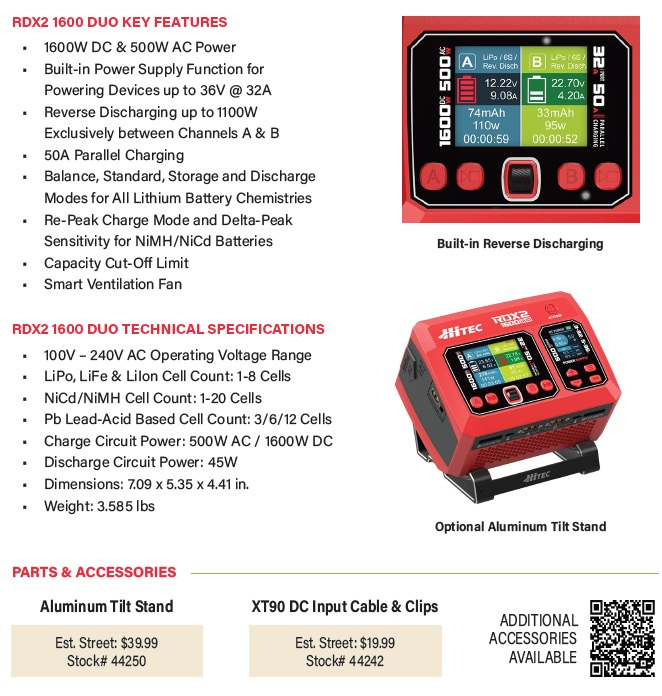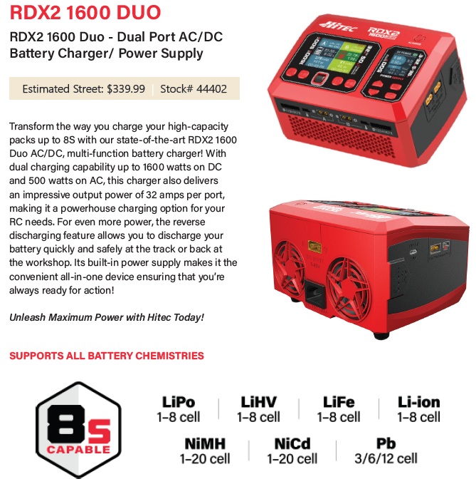 Juice up your packs with the latest charger release from the crew at Hitec. Here is the Hitec RDX2 1600 Duo dual port AC/DC battery charger.