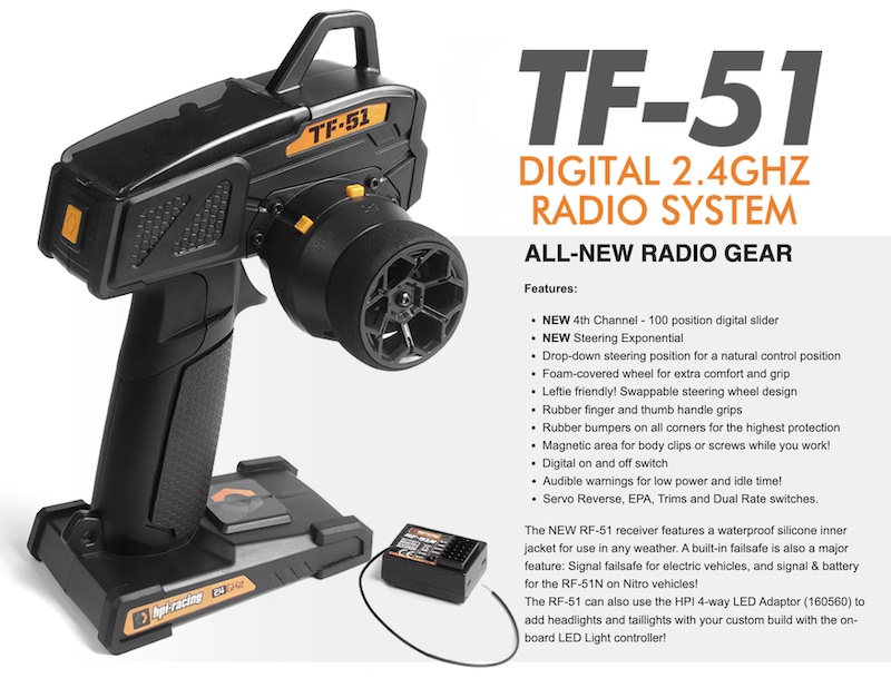 HPI’s TF-51 radio looks comfortable with its drop-down wheel, which can be set up for lefty use – nice touch. The four-channel pistol also gets rubber grips and bumpers, and ample adjustable setting including end points, dual rate, and steering expo. It’s pretty loaded, especially for an RTR radio.