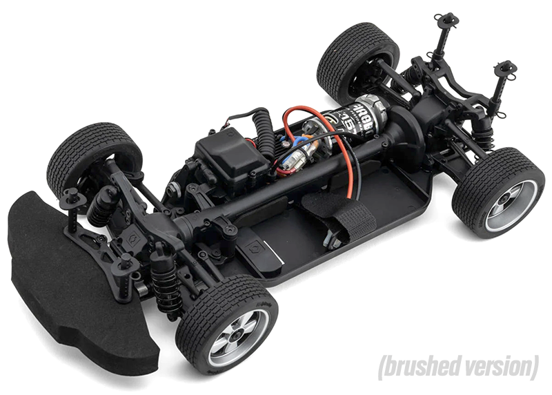 The Sport 3 chassis is a rugged and proven parking-lot performer with its enclosed shaft-drive system, all-metal motor mount, fully adjustable suspension, and steel dogbone driveshafts – CVD shafts are available as an option, along with lots of other hop-ups, including carbon fiber shock towers and aluminum shocks. That’s the brushed version shown below, but the features are the same.