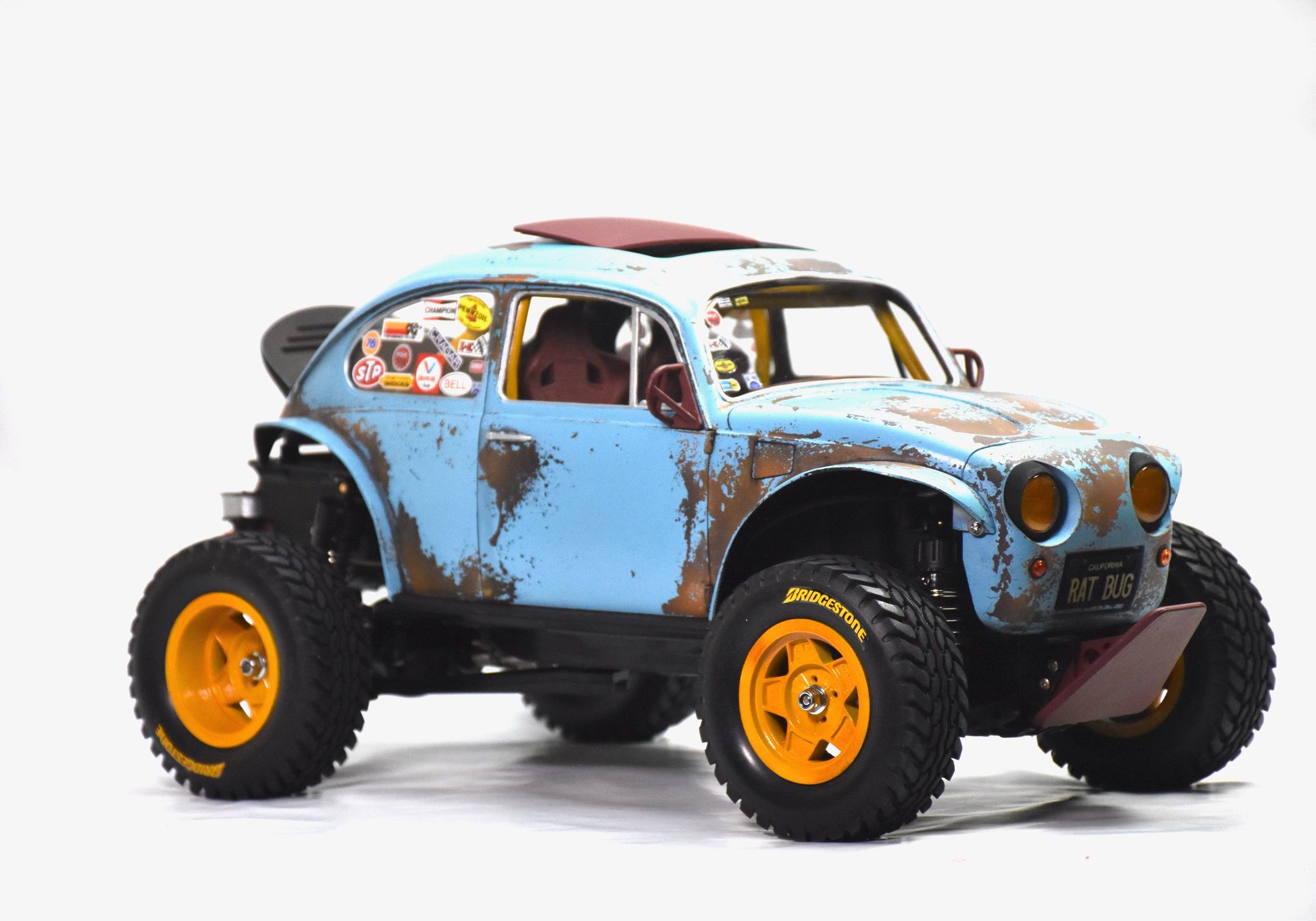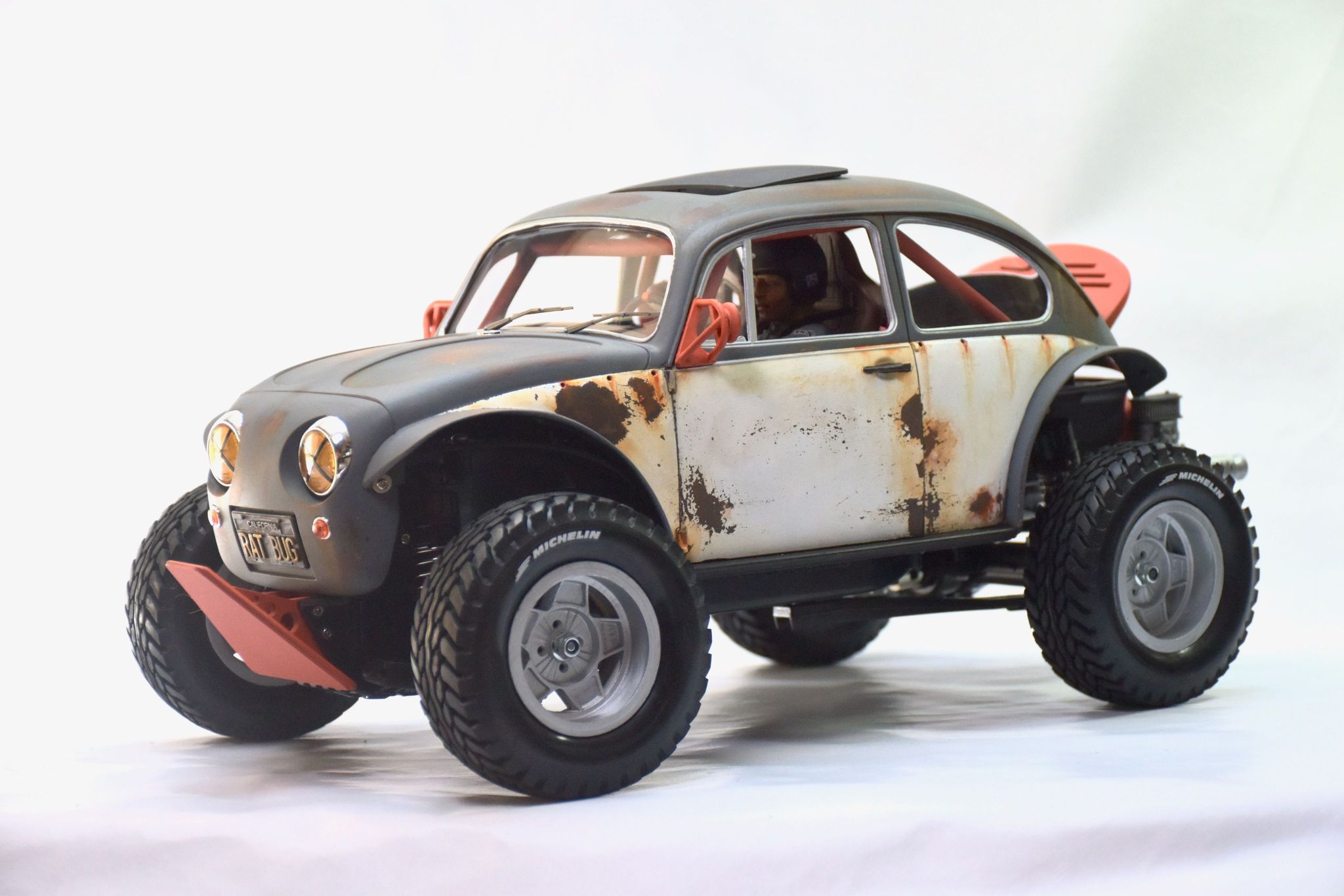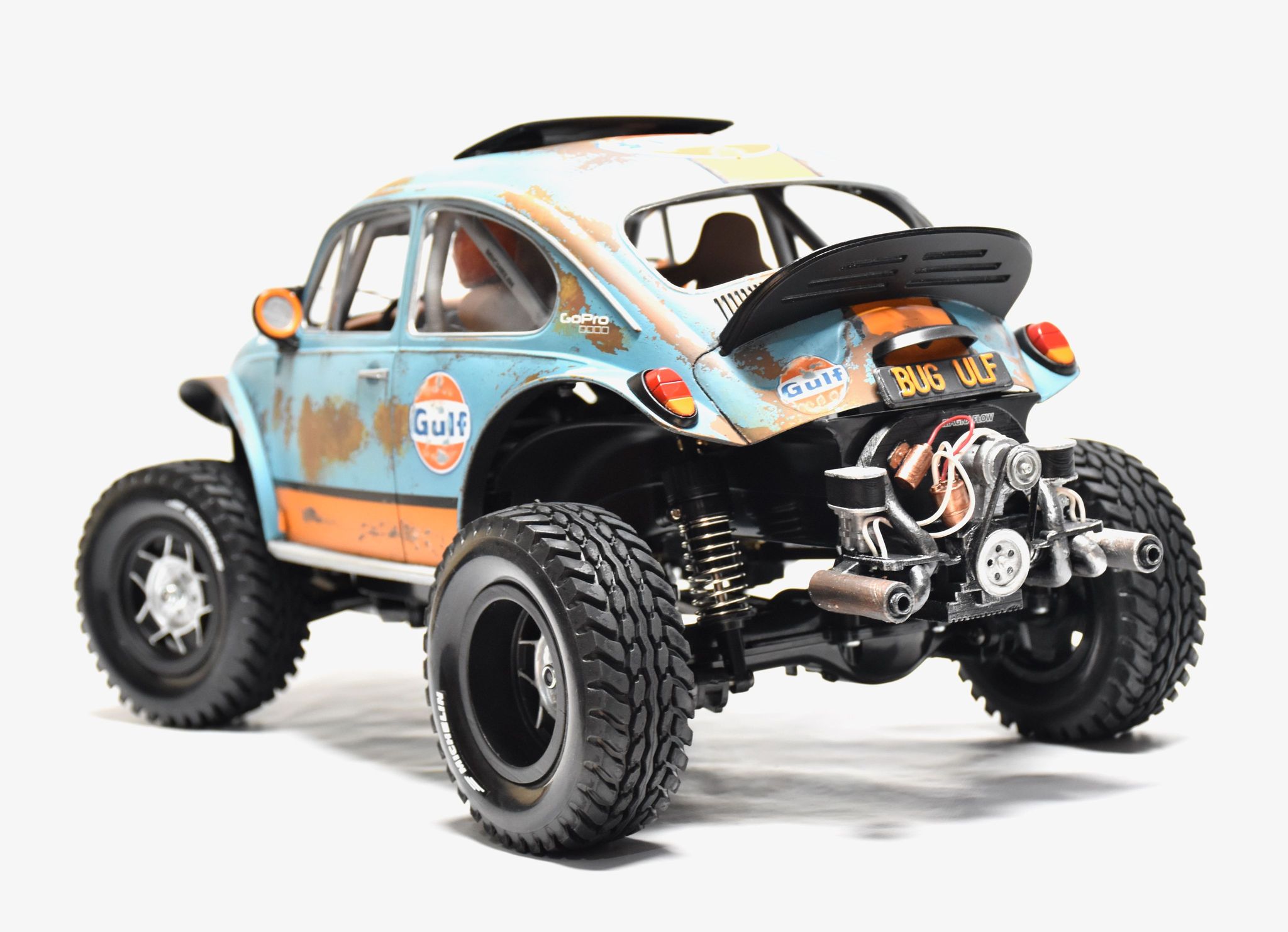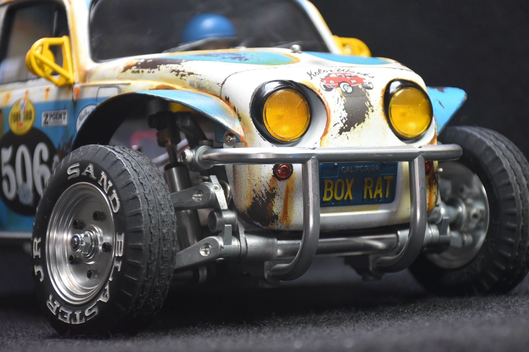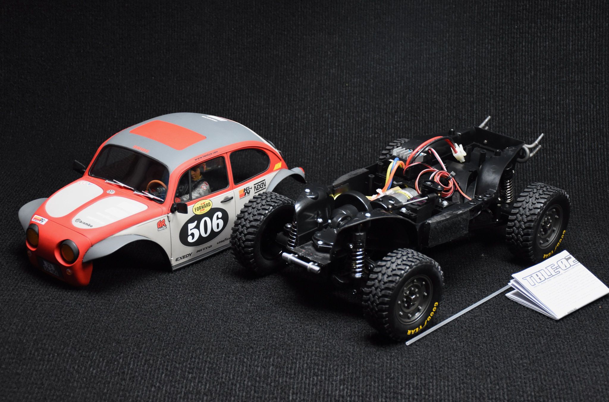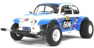 The first Sand Scorcher came out back in 1979 and was then re-released by Tamiya in 2010. The 2010 version is the one that you can still currently buy from Tamiya. It retains the same basic rear-wheel drive 2WD chassis layout as the original and comes with the super-detailed and realistic white polystyrene molded VW bug body. This model realistically reproduces the unique form of the buggy which was seen at the one-make race at the “Baja 1000” in California.
