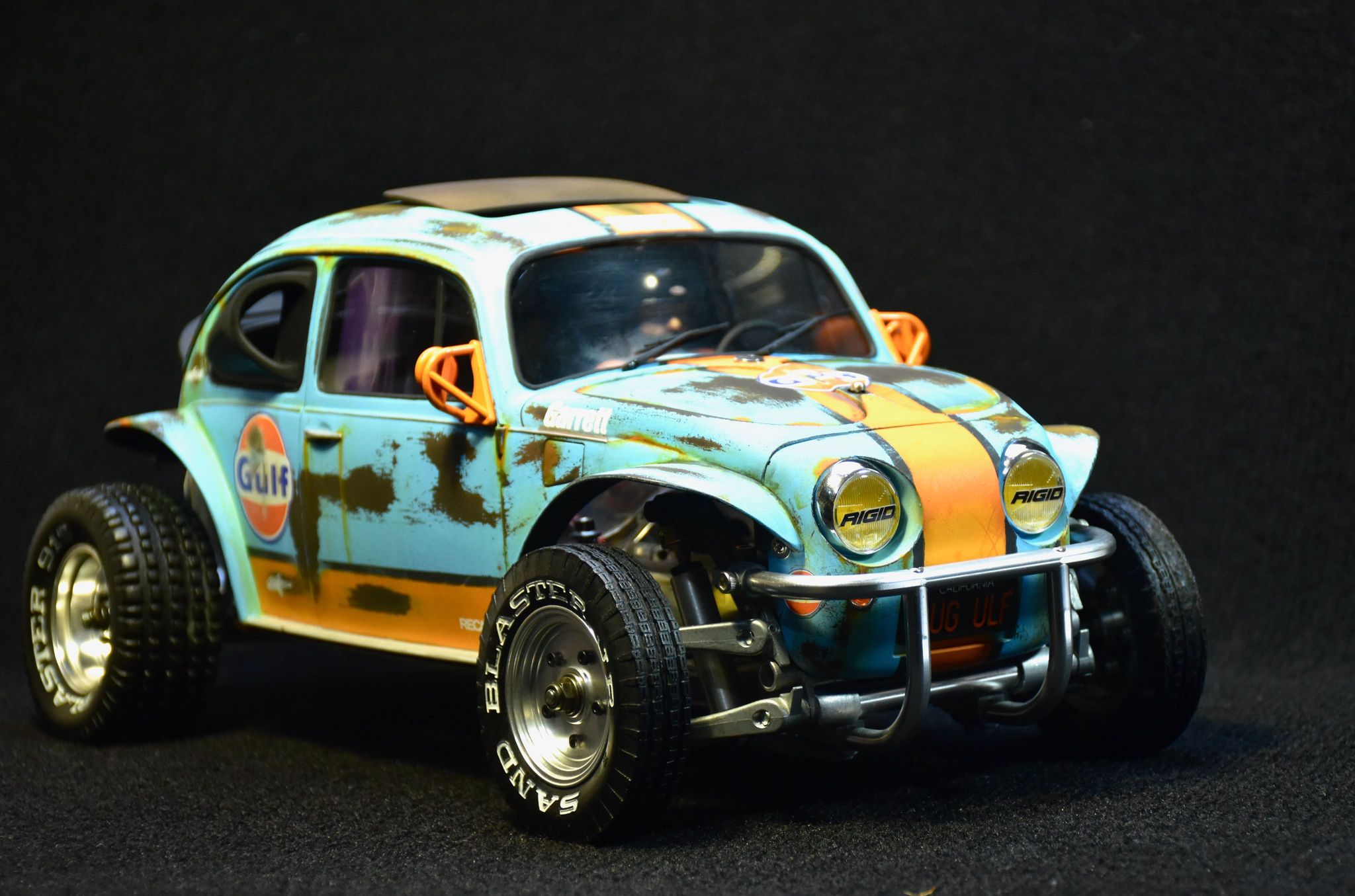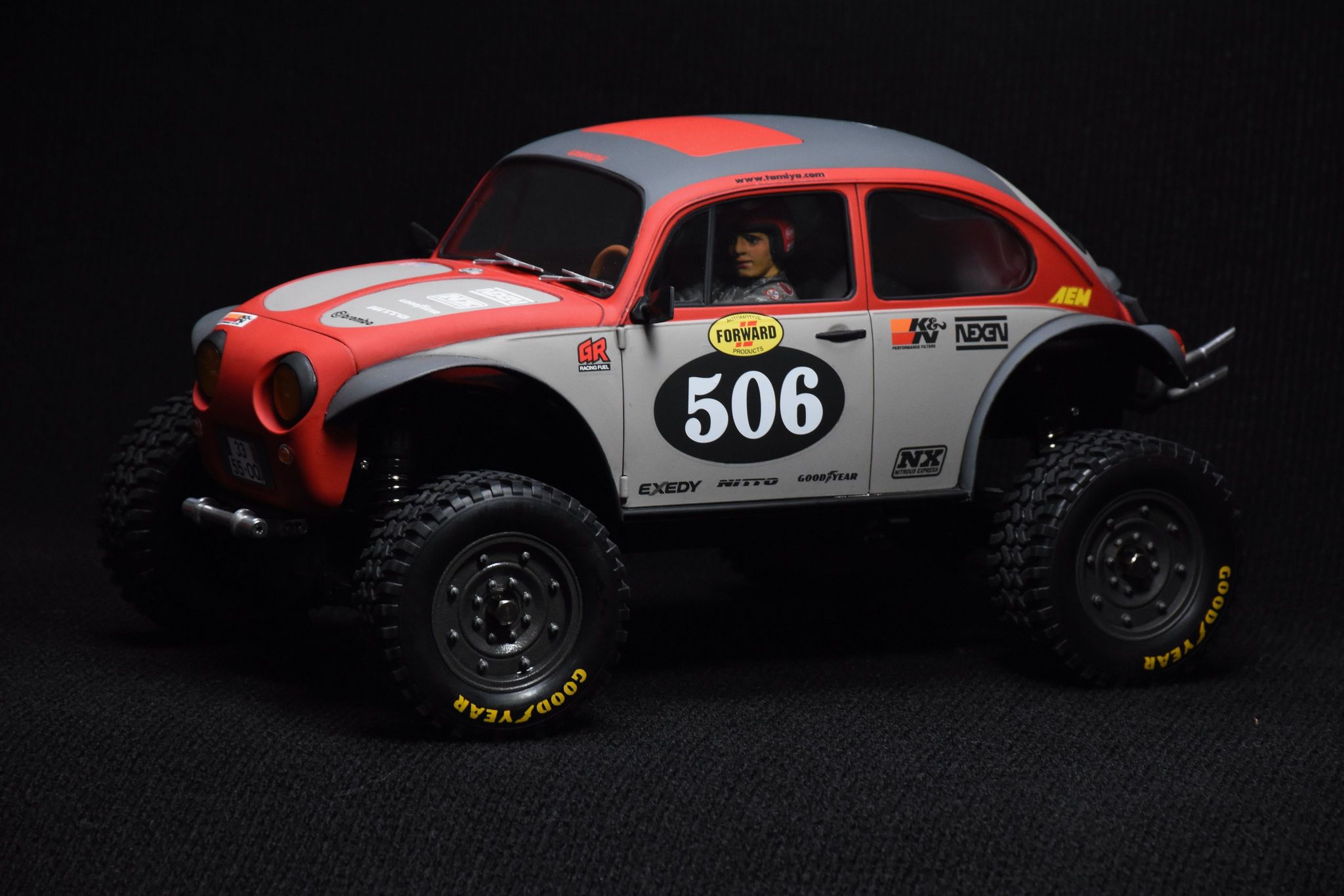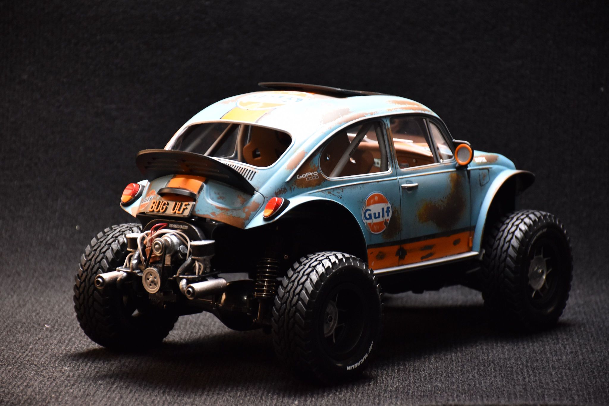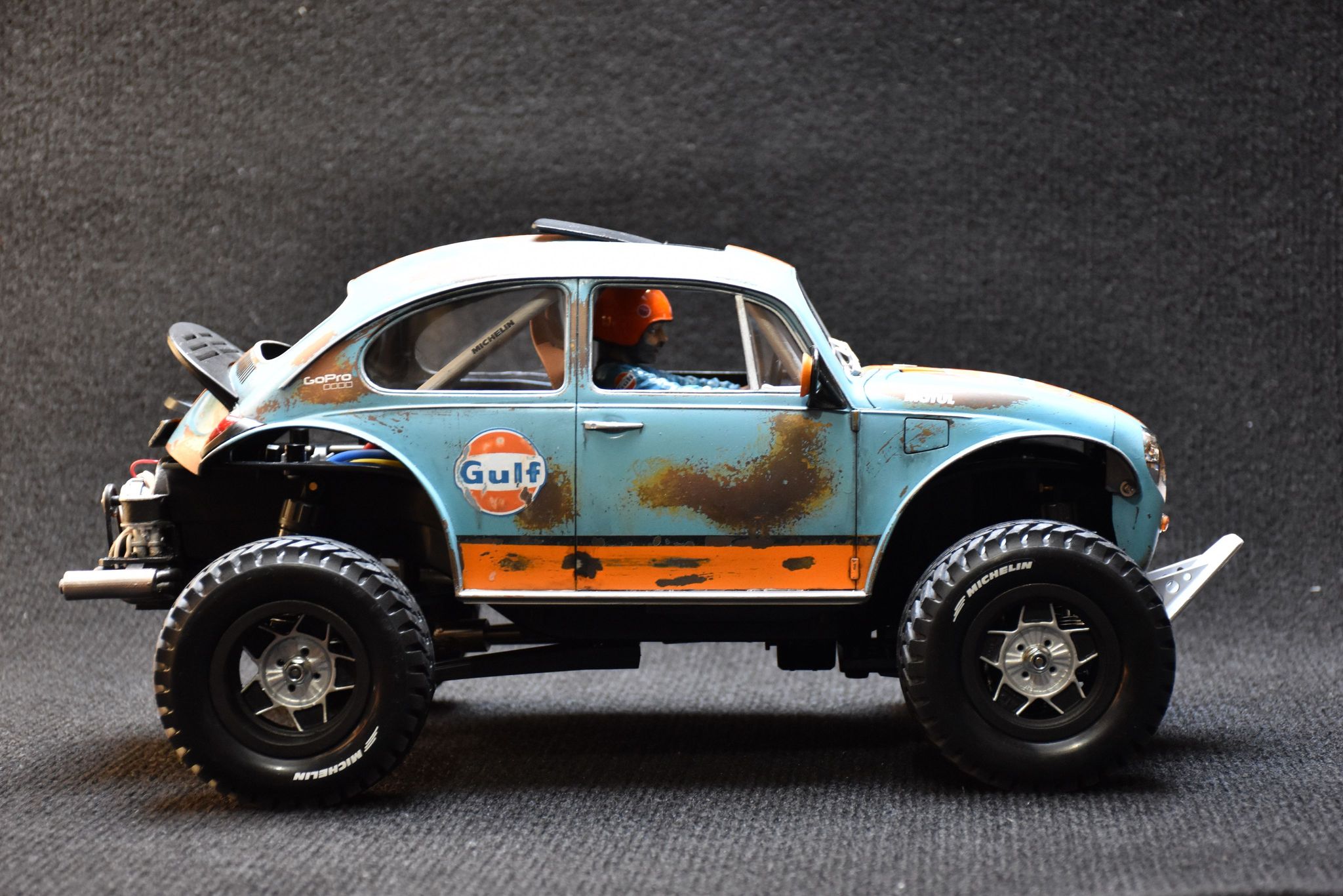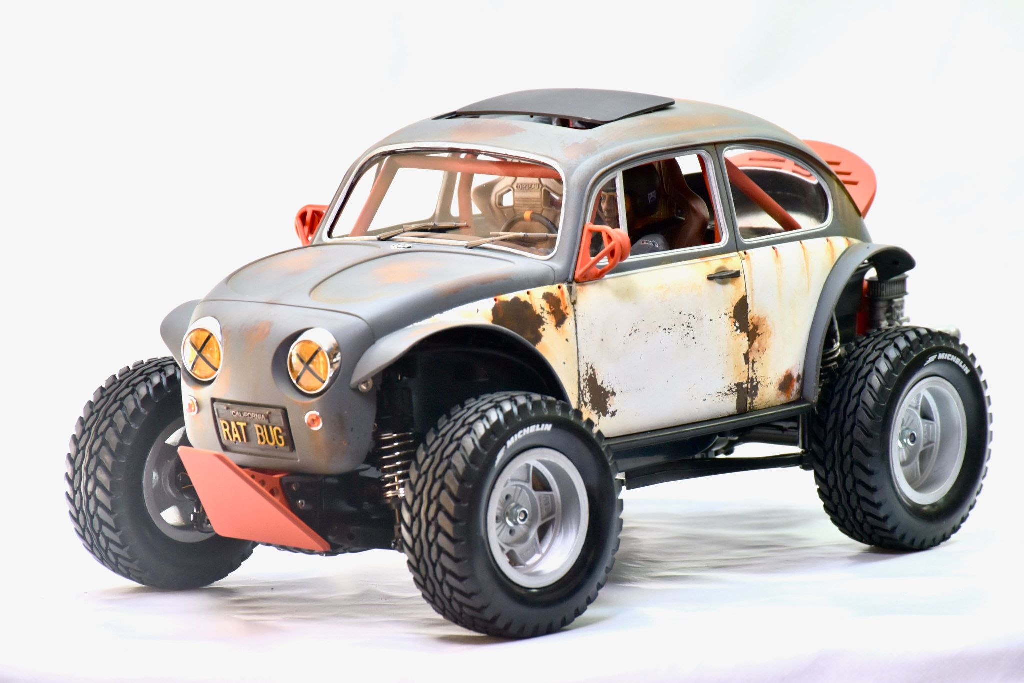 The first Sand Scorcher came out back in 1979 and was then re-released by Tamiya in 2010. The 2010 version is the one that you can still currently buy from Tamiya. It retains the same basic rear-wheel drive 2WD chassis layout as the original and comes with the super-detailed and realistic white polystyrene molded VW bug body. This model realistically reproduces the unique form of the buggy which was seen at the one-make race at the “Baja 1000” in California.