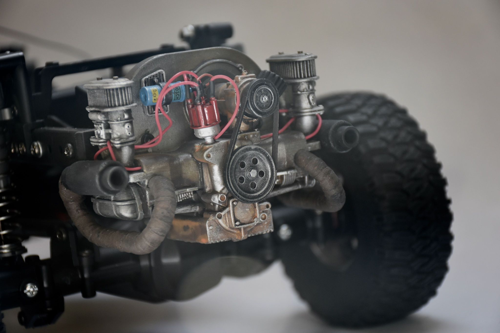 Then after being available for more than twenty years, Tamiya discontinued the CC-01 chassis which forced Bruno to change gears and use the CC-02 that was released in 2019. He developed body mounts and a method where the interior would be attached to the chassis instead of the inside of the body. Similar to Bruno’s previous builds, he added a scratch-built faux engine complete with more scale details that boosts the vehicles realism tenfold.