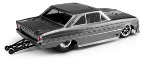 The JConcepts 1963 Ford Falcon body is intended for street racing and drops to the popular Team Associated DR10 and SCT conversions as well as drag racing builds currently in the market. JConcepts maintained a narrow width to match track widths of popular vehicles and to slip through the air at a high rate of speed. Also, a lower trim line on the sides and front chin-spoiler minimizes draft inside the body shell.