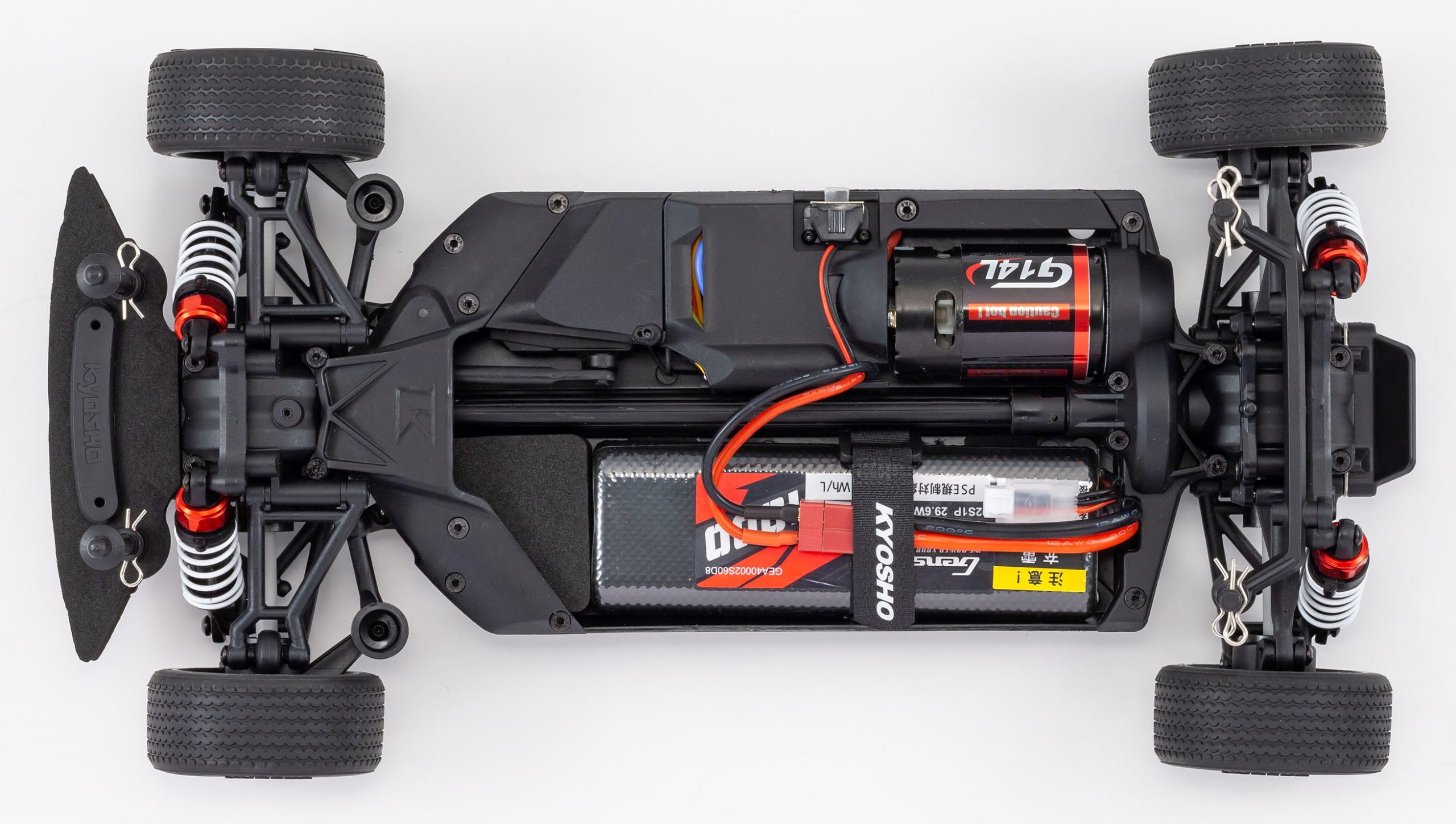 Kyosho has taken its standard touring car chassis and given it a full model makeover that has evolved performance to a new level. A simplified design with fewer parts has improved maintenance efficiency and reduced weight while core strength and rigidity has been increased through new materials and ribbing and stiffeners on front and rear. In addition, the symmetrical chassis design synergizes excellent front-rear balance through the suspension with responsive control, irrespective of power source. Featuring slipper clutch, front & rear gear differentials, oil shocks and full ball bearing specs, the high durability and impact resistance allows drivers to unleash the full potential of the chassis. Brake disc wheel hubs with two different offsets (0mm, +5mm) provide compatibility with 190mm and 200mm width body styles and allows the wheelbase to be adjusted to 260mm by replacing some parts (sold separately) for compatibility with other 1/10 scale body styles, in addition the body included. The Readyset package comes fully assembled and includes everything except charger and battery for the chassis, and batteries for the transmitter.