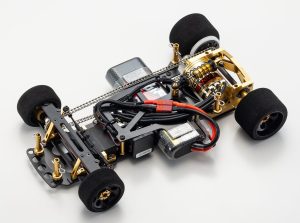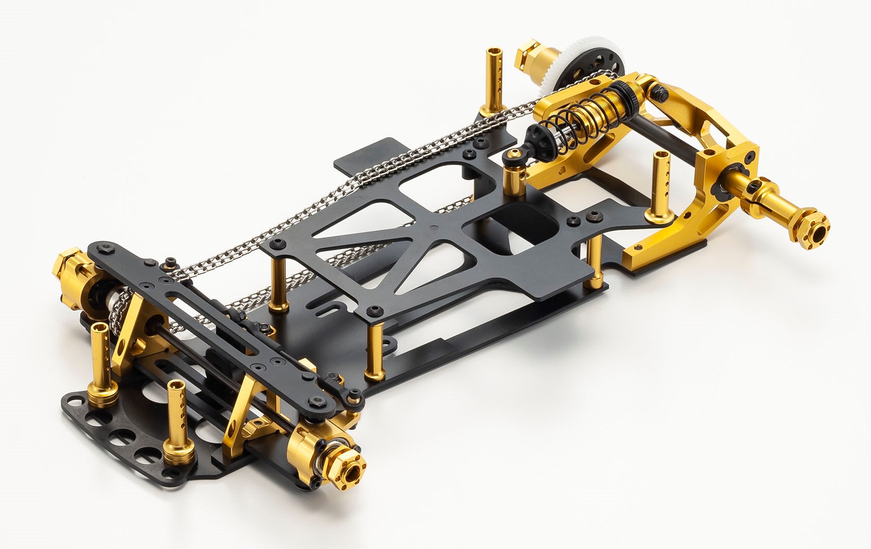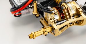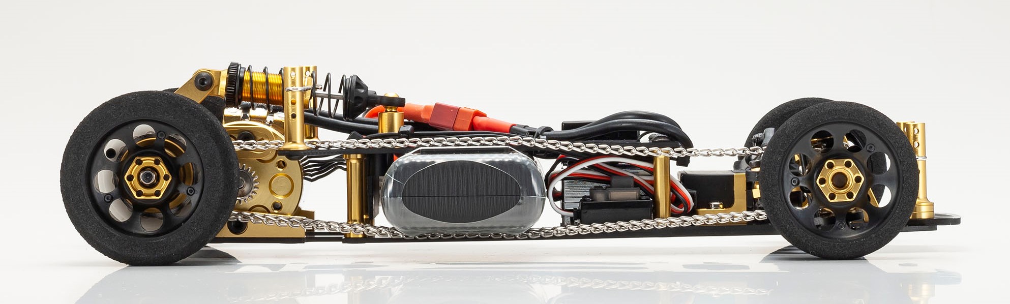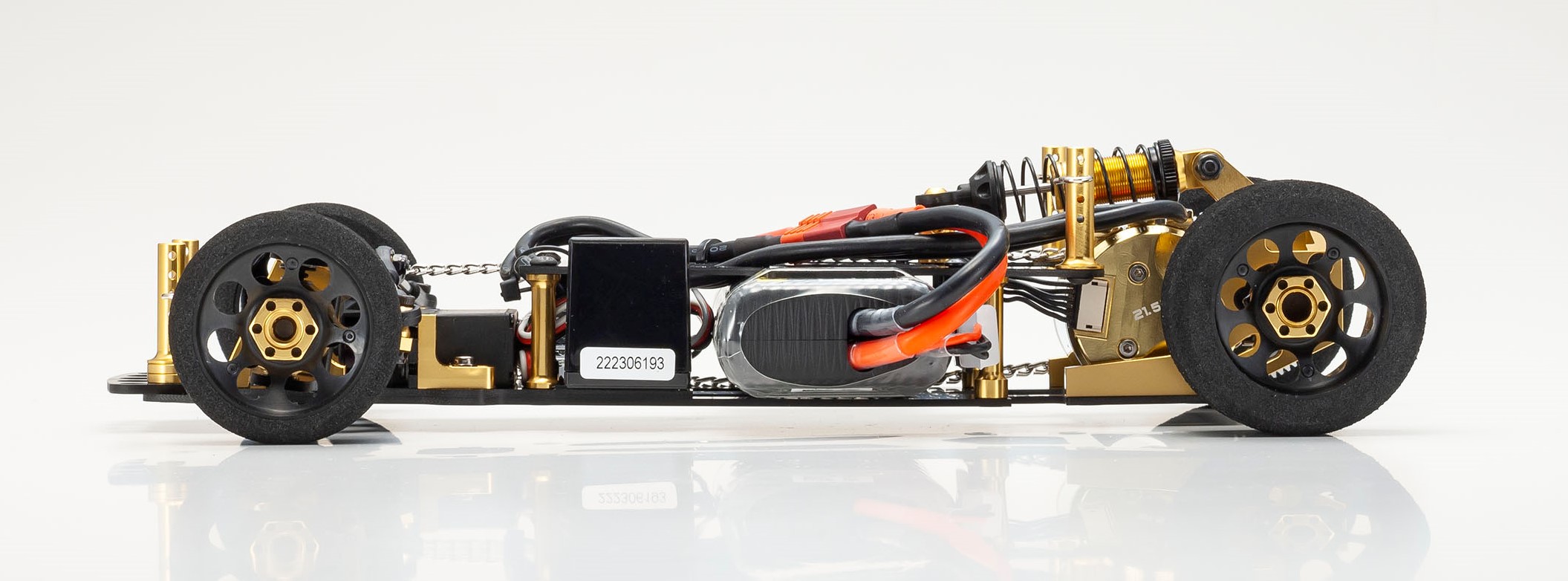 To commemorate Kyosho’s 60th anniversary, this limited-edition of the Fantom EP-4WD Ext features gold anodized aluminum parts and special black front and rear wheels. Performance has been further enhanced with a rear ball diff (not available in 1985) that works in perfect combination with a thicker (increased to 6mm diameter) lightweight carbon shaft that delivers smooth cornering characteristics on various surfaces from asphalt to carpet. In addition, the rear damper has been upgraded to the EFW014 adjustable rear shock (previously optional) to widen the scope of setting options and improve responsiveness for optimized running performance.