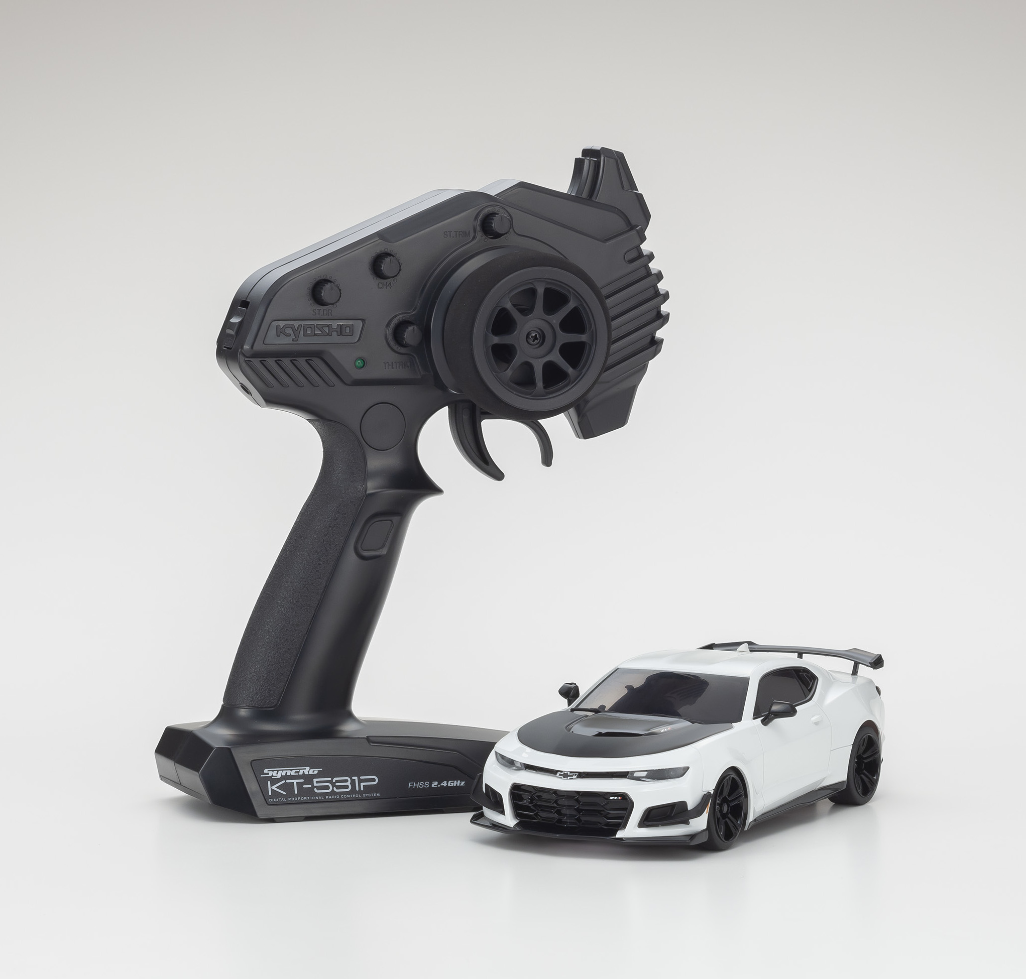 The RWD chassis with new transmitter combination launches a new series to follow the MR-03. With just 8 AAA-size batteries, the MINI-Z Racer allows anyone to enjoy the beautiful style and advanced performance of RC cars. First launched in 2013, Kyosho has renewed the MINI-Z Racer Sports MR-03 concept to be even more user-friendly and appealing to more drivers with the MINI-Z RWD series. Widely popular body styles in highly detailed body sets create the incredibly realistic model lineup. The Chevrolet Camaro ZL1 are among the first bodies released on the RWD series.