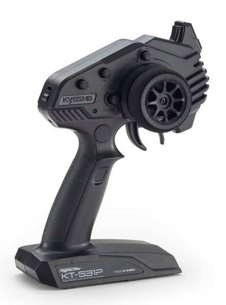 Including the latest Syncro KT-531P transmitter with steering trim, throttle trim, dual rate, LED control function, the sponge grip of the steering wheel provides comfortable fit for precision control and feel. The control program on the newly designed circuit board provides linear handling characteristics and can be further enhanced by installing the optional gyro unit (MZW431). In addition, the transmitter has a Training Mode feature which limits speed of the car for easy learning (default setting at the time of shipment is Training Mode).