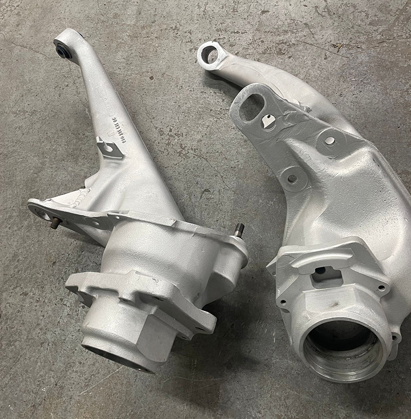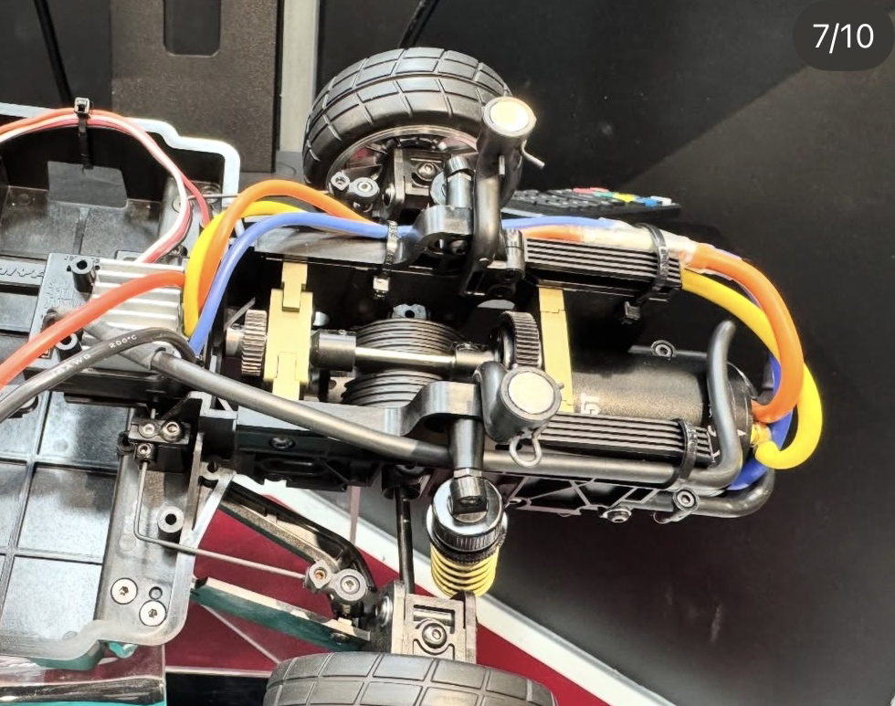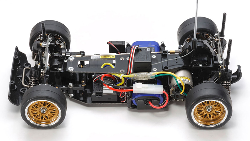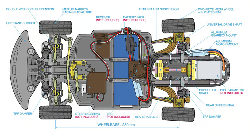A few things to note here: the gold-anodized aluminum motor mount and gear support; the magnetic body mounts; and the wild drivetrain configuration, which we’ll get to in a sec. If it looks like the suspension is missing something, you’re right: there are no camber links. Tamiya doesn’t make an effort to shape the suspension arms like the “real thing” (below), but they function the same way.
