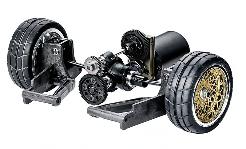 Like the full-size 934, the motor is mounted longitudinally. This places the motor’s output shaft close to the differential, leaving little room for the gears required to provide an appropriate final drive ratio. Tamiya’s solution sends motor power over the top of the diff via a single gear mesh and dogbone driveshaft, then drops it back down with another gear mesh to spin the bevel pinion that engages the diff’s ring gear. (Also worth noting: the diff looks pretty stout with that four-bolt housing).