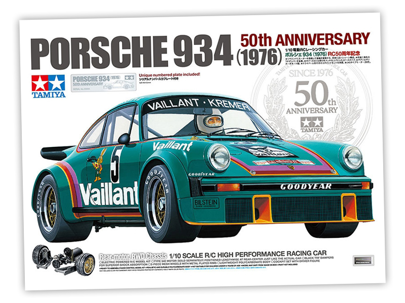 Tamiya is once again celebrating the anniversary of its first-ever RC model, the 1/12 scale Porsche 934 released in 1976. Motorized models were nothing new for Tamiya at the time, but this was the first to get a dedicated chassis designed for radio control. Fittingly, Tamiya has revisited the 934 with each anniversary of the original’s debut, though in larger 1/10 scale (and with a quantum leap in durability and performance).