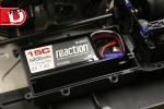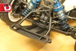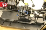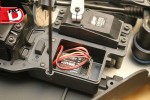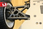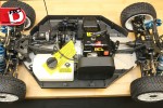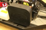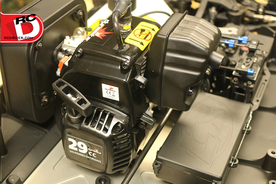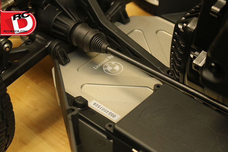 After grabbing a 4mm hex driver we pulled the four cage screws off, removed four big body clips and pulled the body off to reveal the chassis. We instantly noticed a small etching at the back of the chassis where it says “Licensed By” and has the BMW logo below it. Very cool! Its here we also noticed a new low rear chassis brace, probably for aftermarket pipe clearance. The arms on the 5IVE MINI are noticeably shorter than the truck version which means the driveshafts are also shorter. The towers and shocks are shared as well as the hubs, knuckles and hardware. The impressive 8IGHT Buggy inspired drive-line is also carried over here, but the big change is the engine. A Dynamite 29cc gasoline engine sits ready for action. The engine is fitted with a large muffler and an oversized composite plastic sardine can looking air-filter. If you’re wondering where the air intake is on the box, its vented at the bottom.