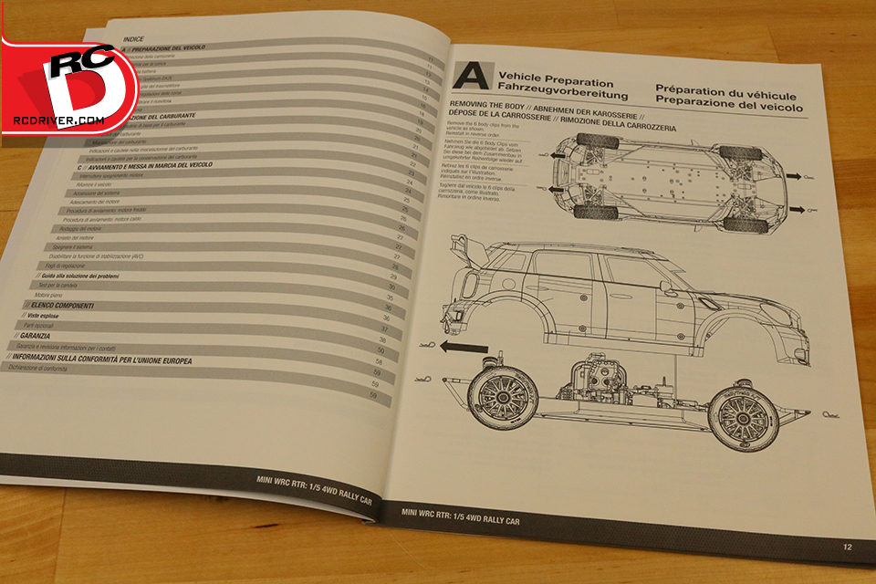The box is big, real big, so if you’re friends with your UPS or FedEx guy, prepare for that friendship to end when he or she has to lug this box to your doorstep. I feel for the stock up guys at the LHS too; eat your Wheaties. But once you break into that box you’ll see the 5IVE MINI nicely wrapped up in protective plastic with card-board protection as well. As we pulled the plastic wrapper off like it was a birthday present, you instantly get giddy seeing the impressive officially licensed replica of the John Cooper Works World Rally Championship (WRC) MINI Countryman body. The bodies 3-piece design is well-detailed and wraps around a full inner roll cage. The cage bolts and clips to the chassis much like the 5IVE-T with access to the internals through the front windshield vent and the driver rear window where you can access the pull start. That’s when we noticed it, a pull start. The first version we saw had a prototype electric on-board starter and fuel injection and the photos of the car still show the equipment on Losi’s site (editors note 3/9/15: photos have now been changed to reflect a standard engine). But somewhere along the line it appears the electric starter was ditched for the tried-and-true pull-starter. We’re actually not deeply saddened by the loss of the electric start, it was just neat option and we’re sure it loss helped keep some end cost down.