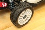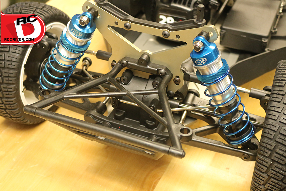 The radio box with large scale servos sits on the opposite side of the engine and the included LiPo battery is already sitting in its rearward box. But in the receiver box, there is a new addition to the 5IVE RTR platform, a Spektrum SRS4200 receiver with AVC control to help tame this wild beast for those throttle happy drivers. New front and rear bumpers are used to accommodate the new body set-up and new wheels with aggressive Losi Rally Trekk tires wrapped around them for all terrain traction.