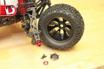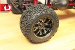 Losi’s ATX tires wrap around 420 black chrome wheels. Under the wheel cap is a 17mm hex nut. The inserts in the tires are firm.