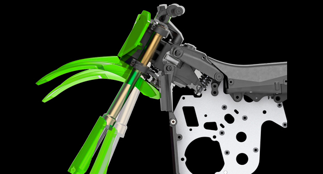The mechanical technology is equally impressive. Losi’s product development team studied full-size motorcycle suspension geometry to give the Promoto-MX the same terrain handling characteristics. A rising rate rear suspension provides superior grip and prevents bottoming out in landings. The completely new front fork design, with an internal spring and dampener, can be tuned by changing the silicone dampening fluid and also allows ride height adjustments. An innovative front and rear wheel braking system gives the bike impressive stopping power, cutting the stopping distance in half compared to rear brake only.