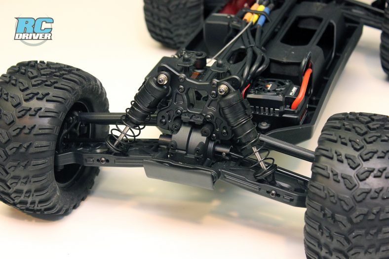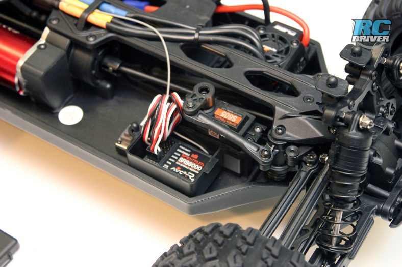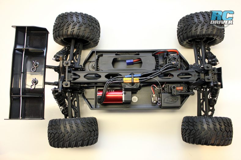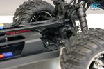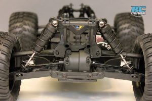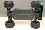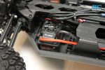 The truggy gets a long molded composite chassis as the foundation for the truck. There is a battery hatch located on the bottom of the chassis so you can easily remove the battery without having to remove the body. A small cam like mechanism secures the hatch and unlocks by using the included chip to turn it 180-degrees. On top, the chassis has lots of bracing, including the chassis stiffeners we’re used to seeing on the 8ight based vehicles. You’ll also find the 8ight style dual bellcrank steering with built in servo saver, a long top deck and ample space for the electronics package.