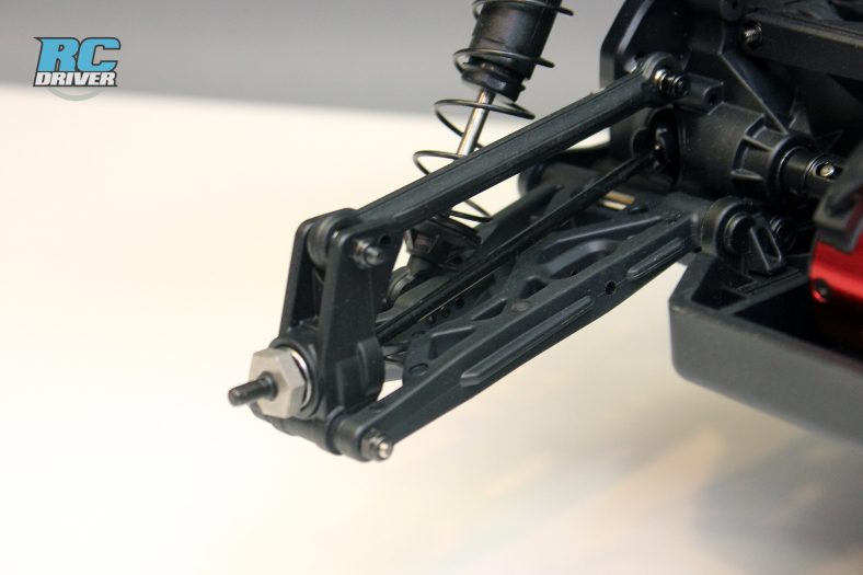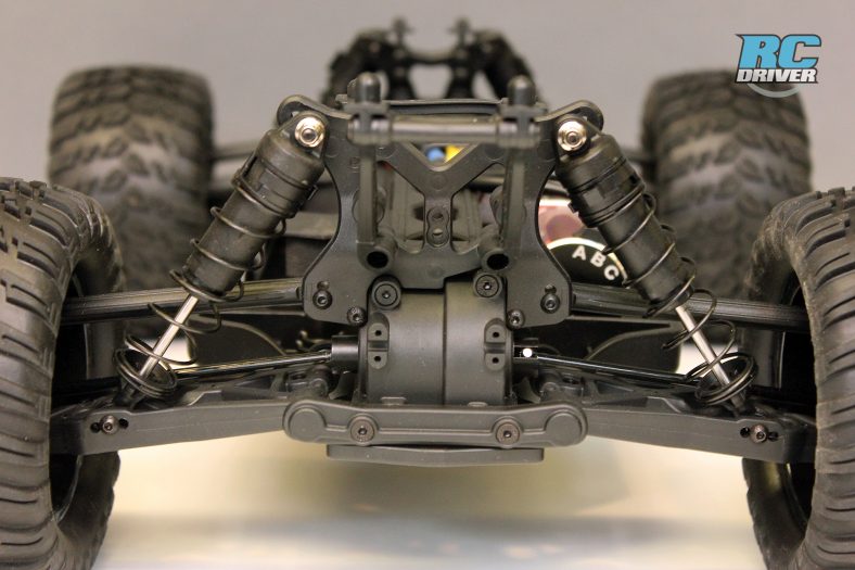 Although some changes have been made, you can still see some 8ight suspension inspiration integrated into the Tenacity-T. Large 12mm bore shocks damp the suspension and mount to composite plastic shock towers. Rigid lower arms and fixed upper links are secured to the gearcases with aluminum hinge pin plates with plastic pin covers. The shock towers are composite plastic and the hubs, steering knuckles and caster blocks have all been pulled from the 8ight inspired TEN family which are proven components that work well in racing and will work well here on a basher machine.