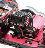 Finally let’s go to the finishing touches, starting with the body. The XXL2-E is a truck and the truck body included is painted from the factory with some cool graphics backed with lighting. The body’s shape reminds me of an imaginative variation of a Chevy Avalanche with tall bed sides. I see what Losi was doing here, creating a sleek truck body with shallow bed to reduce the chances of breaking during bashing, I like it. Behind the truck a wheelie bar is bolted to the rear suspension brace plate with two plastic wheelie wheels and an aluminum support brace. Love it, leave it, you’re going to need it; this truck spends a lot of time lifting the nose. The wheels are a cool dark chrome with spoke style rims and 6-bolt hex nut cover plates. 420 ATX tires are glued to the rims from the factory and have a firm tread to conquer all sorts of surfaces. Now I have to ding Losi here. Two of the four wheel nuts were not completely tightened down to secure the wheel, but the nuts were secured in place with red thread lock. The wobbly wheels could have worn or stripped if I didn’t notice it before running so I suggest you take the time and check all four wheel wheels to make sure they are held on tight before your first run.
